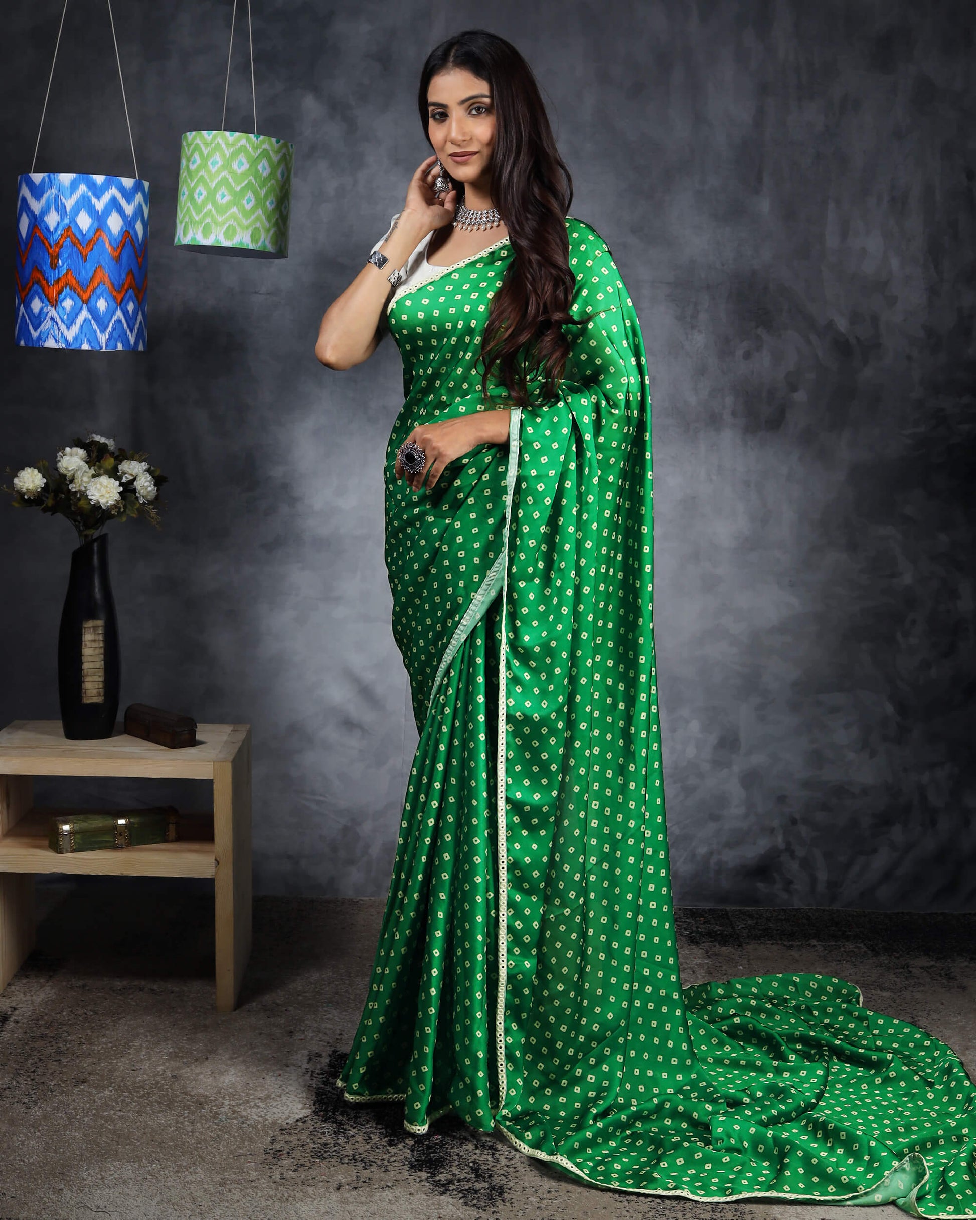 Forest Green And Beige Bandhanii Pattern Digital Print Georgette Satin Saree With Foil Mirror Work Lace Border