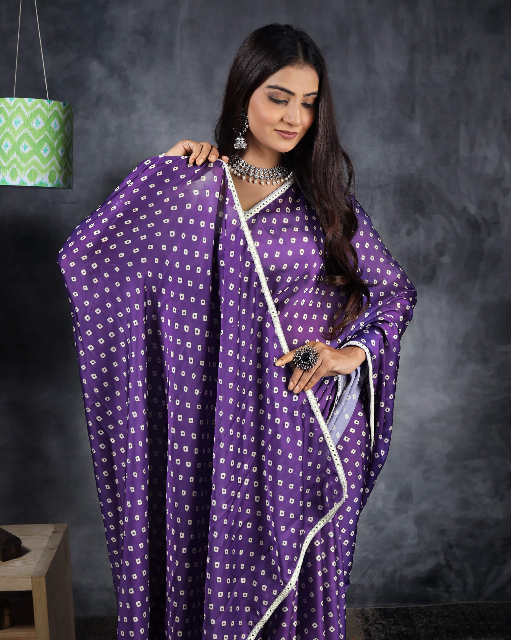 Grape Purple And White Bandhanii Pattern Digital Print Georgette Satin Saree With Foil Mirror Work Lace Border