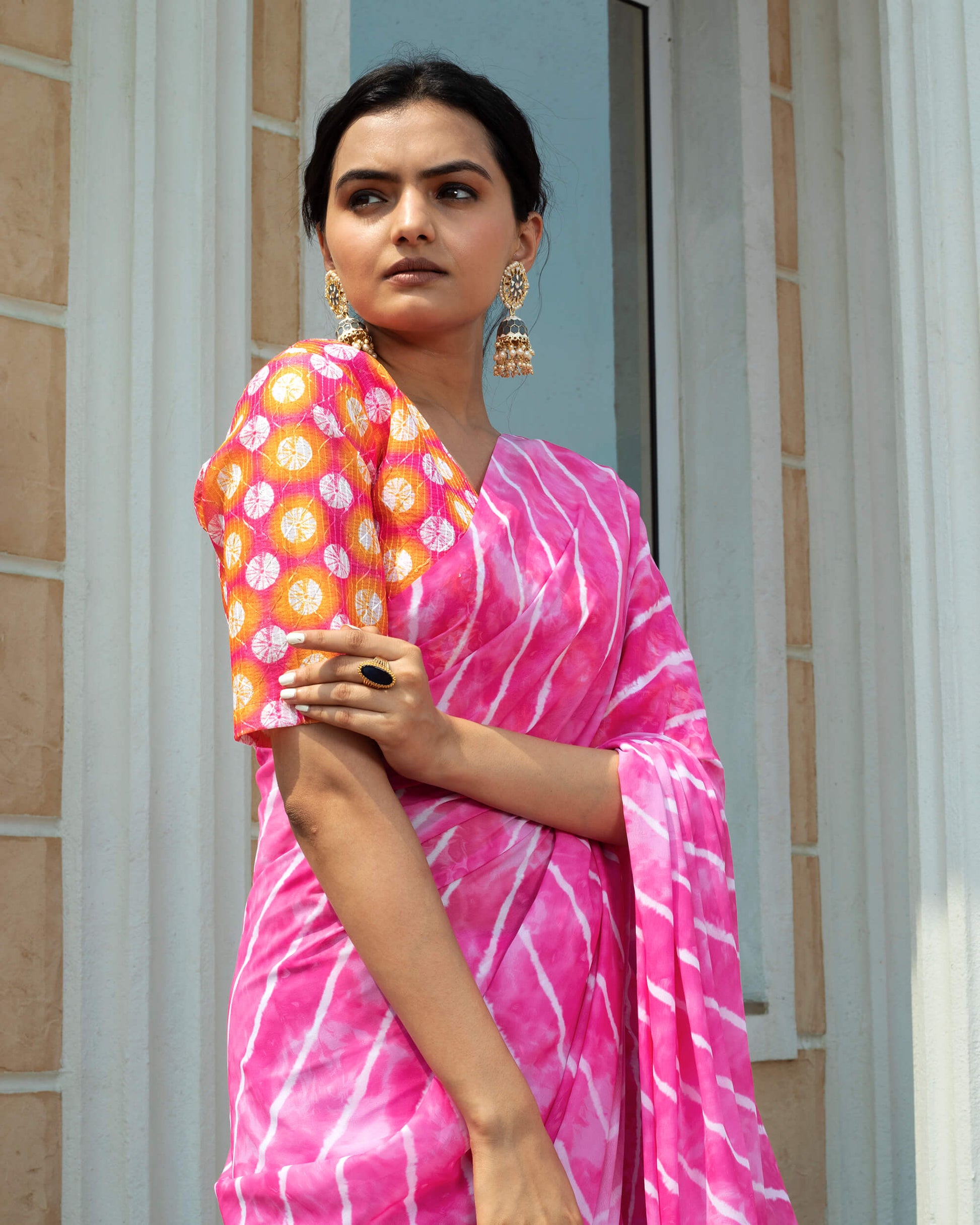 Hot Pink And White Leheriya Pattern Digital Print Georgette Saree With Tassels