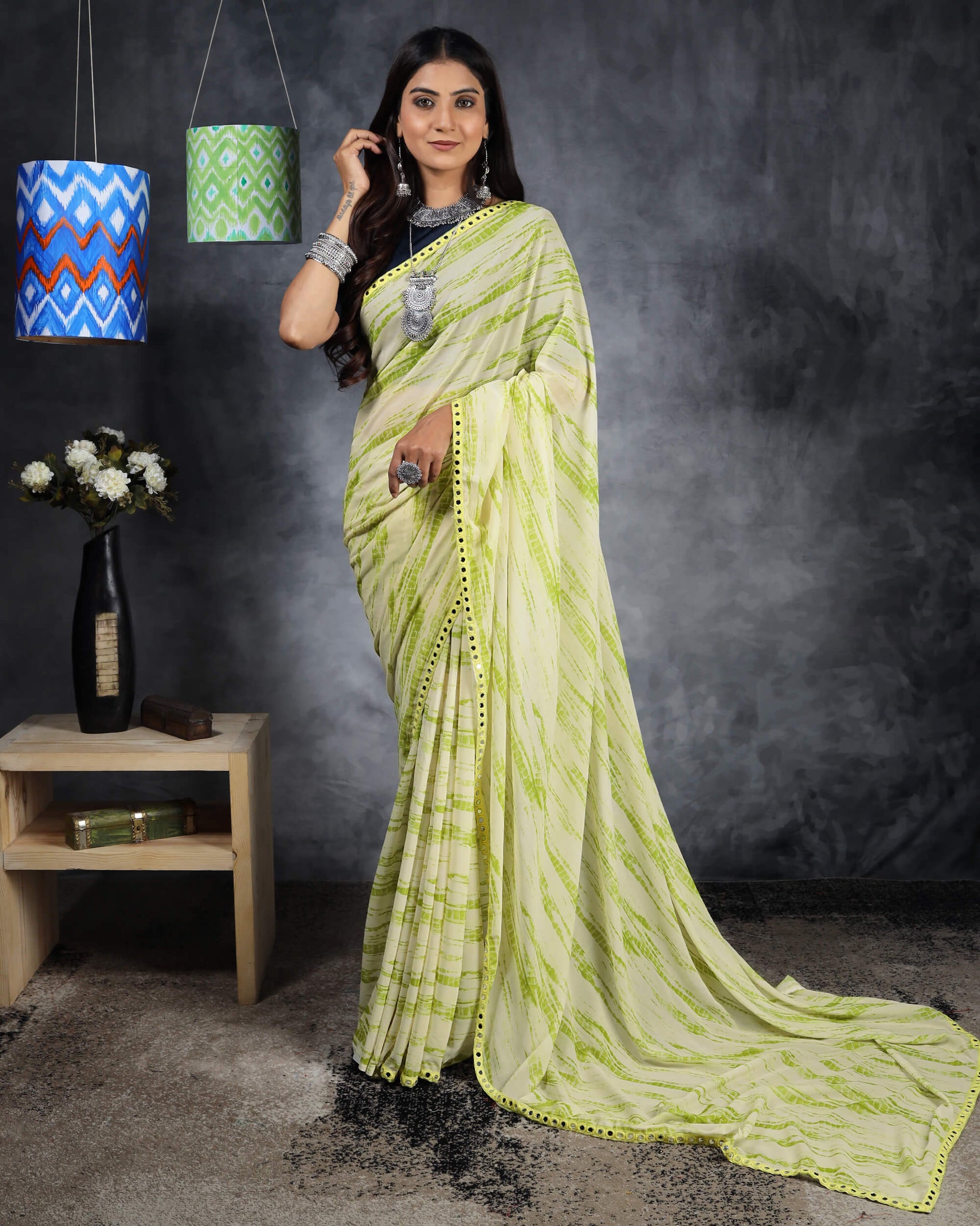 Lime Green And White Shiiborii Pattern Digital Print Crepe Silk Saree With Mirror Work Lace Border