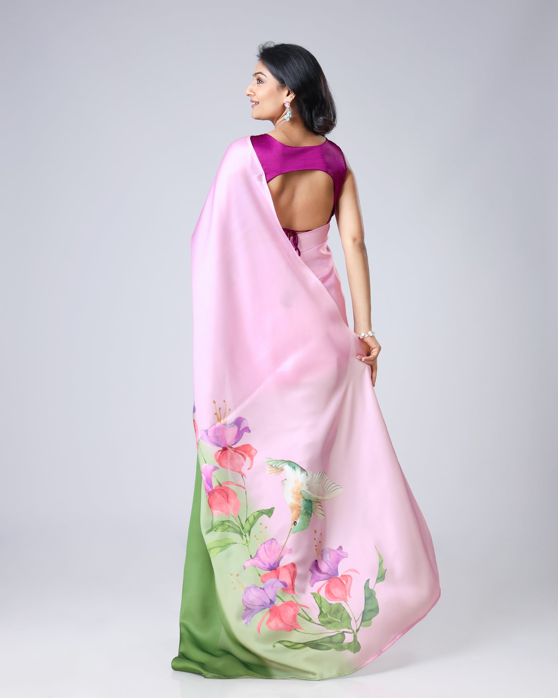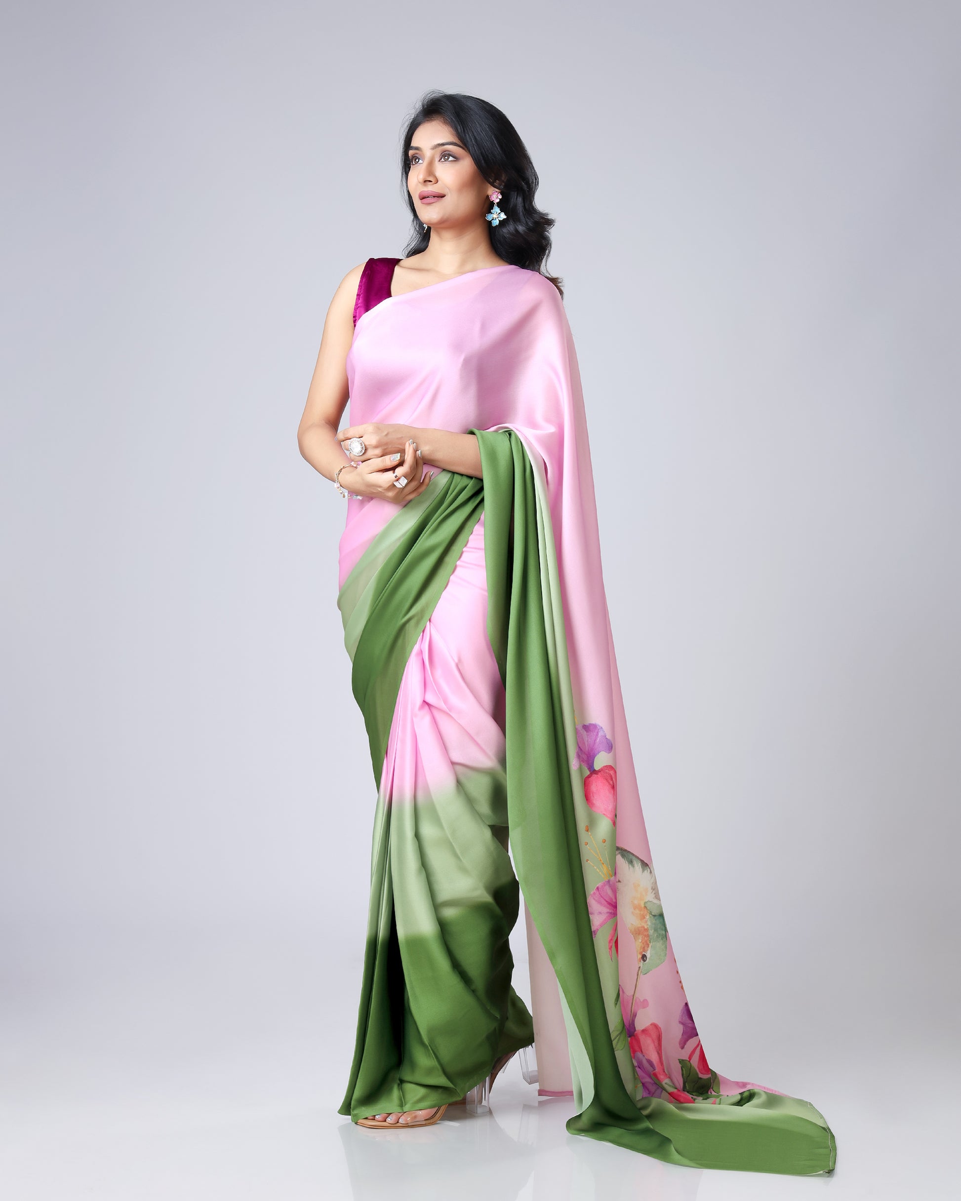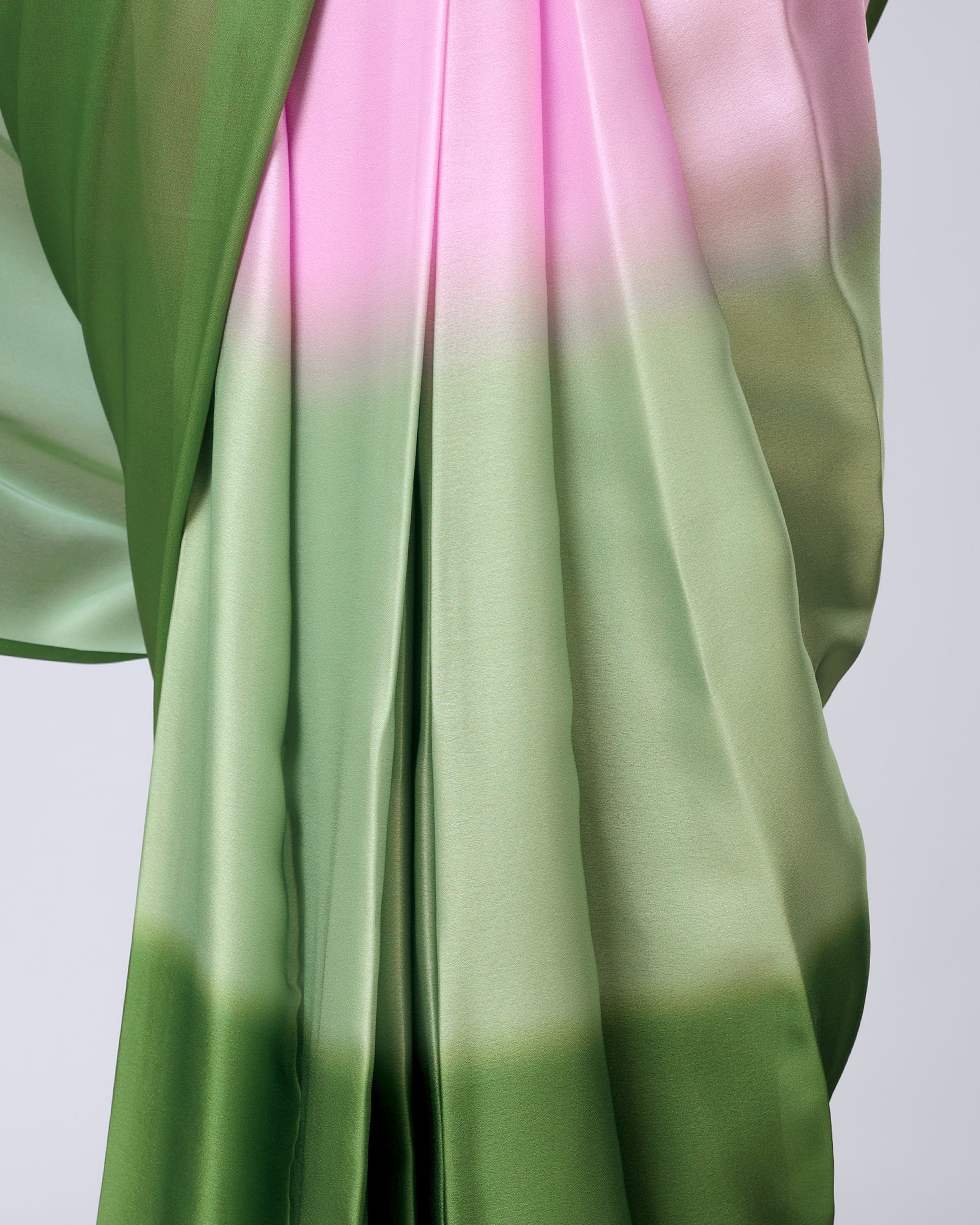Add a fun twist to your wardrobe with this ombre saree! Designed for those who love to stand out, it features playful prints, bold colors, and a touch of drama. Whether it's a college fest, brunch, or just a day you want to feel fabulous, this saree brings joy and personality to your look.