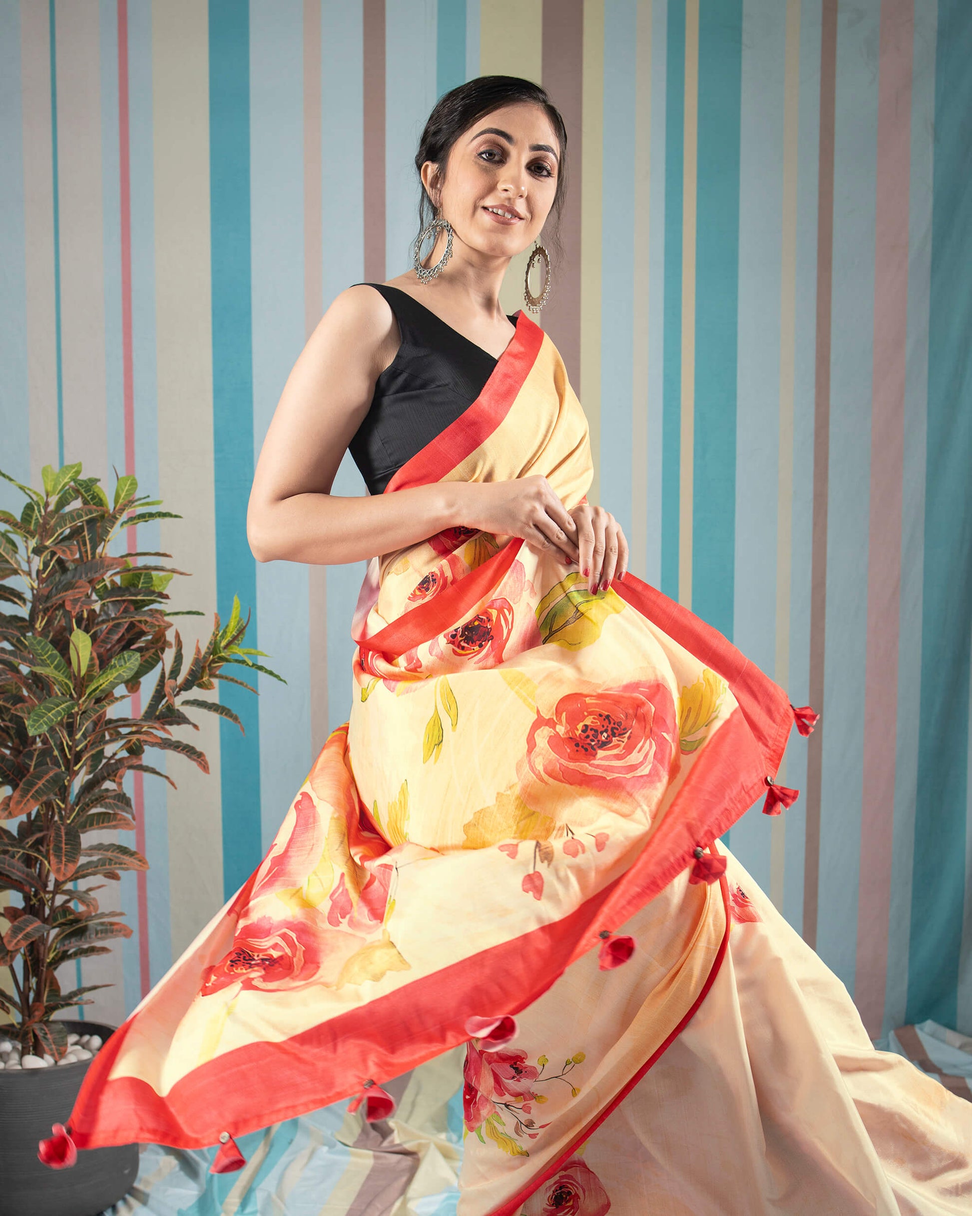 Mellow Yellow And Red Floral Pattern Digital Print Crepe Silk Saree With Tassels