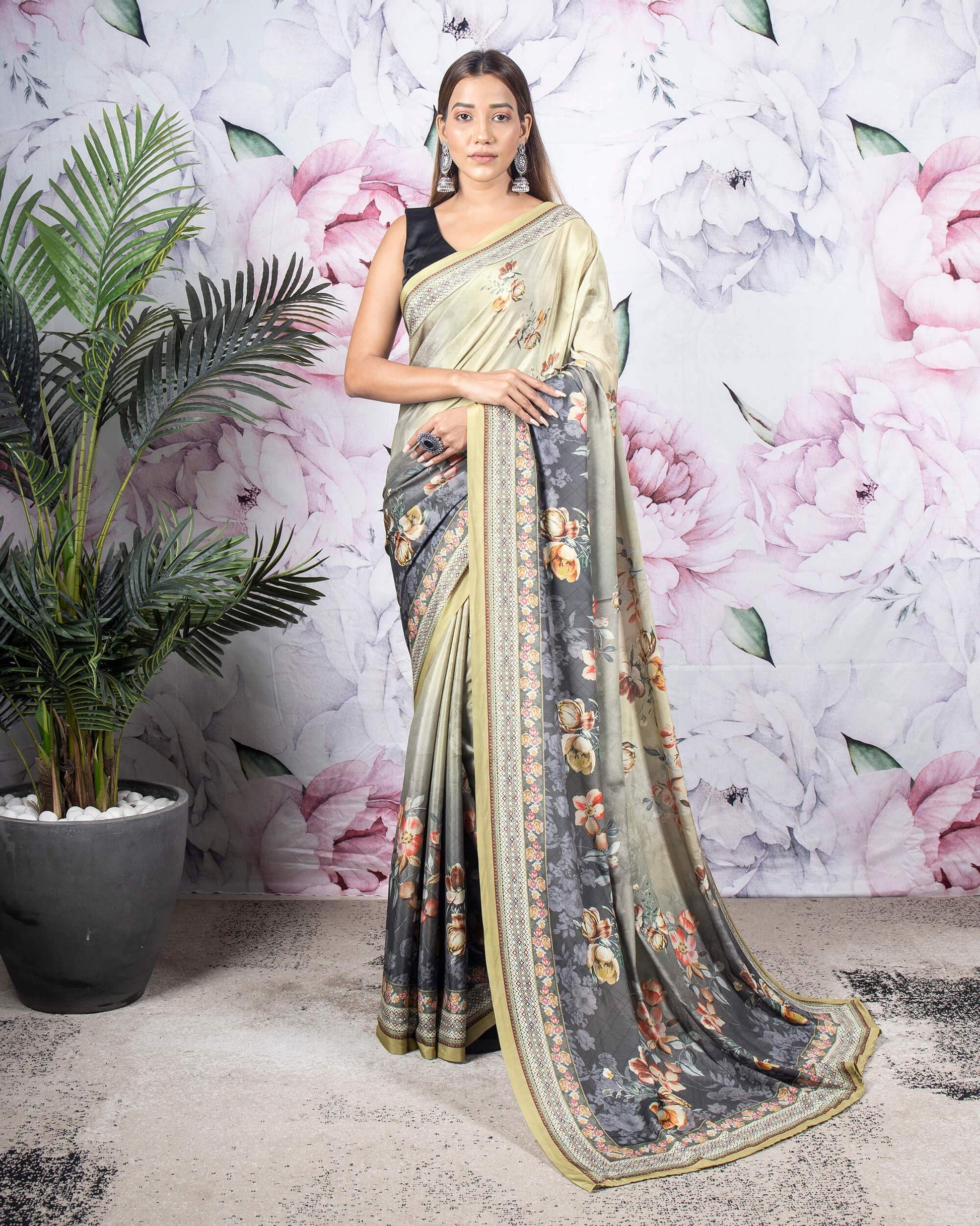 Moss Green And Grey Floral Pattern Digital Print Crepe Silk Saree
