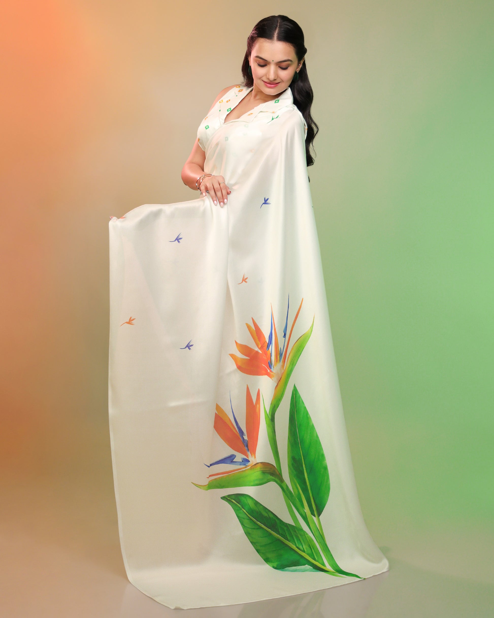 This stunning tri-color saree weaves together the soul of saffron, the purity of white, and the courage of green — finished with a modern silhouette and flowy grace that makes it perfect for Independence Day celebrations, cultural events, or simply making a statement.