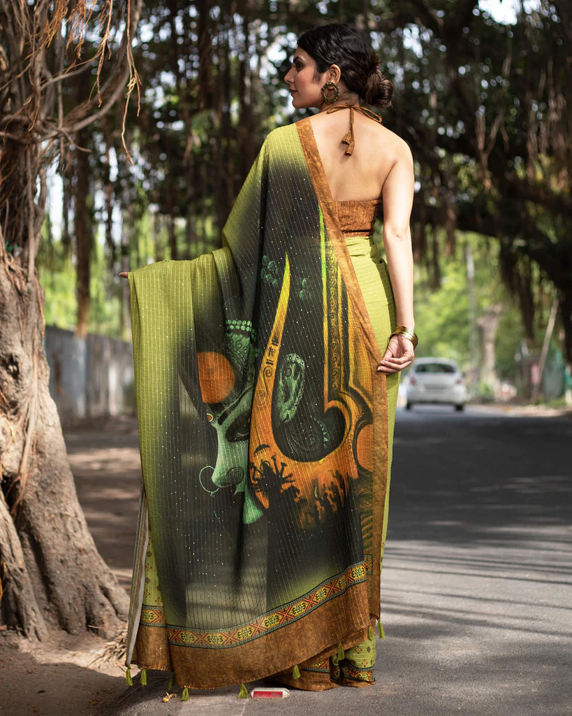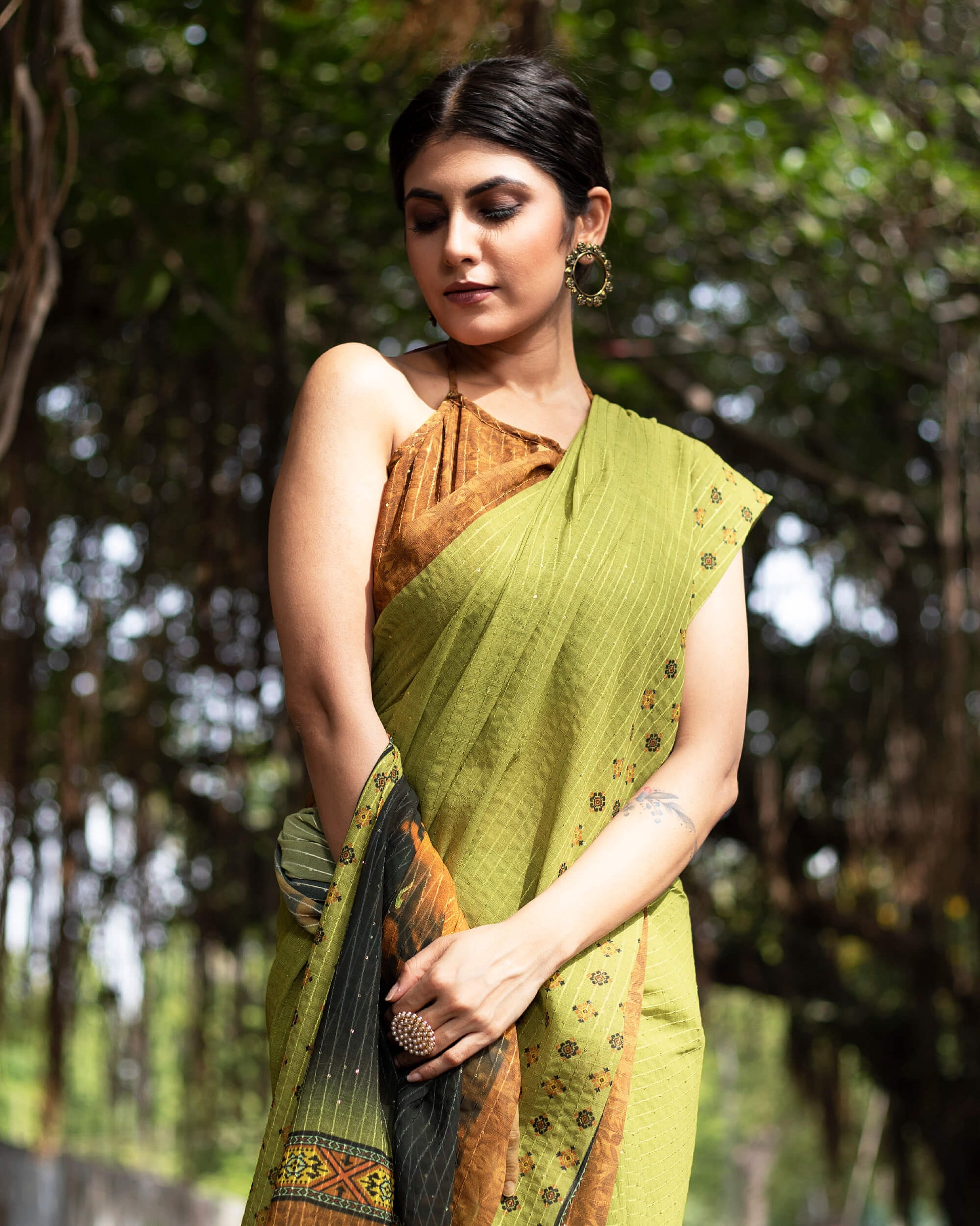 Olive Green And Black Quirky Pattern Premium Sequins Georgette Saree With Tassels