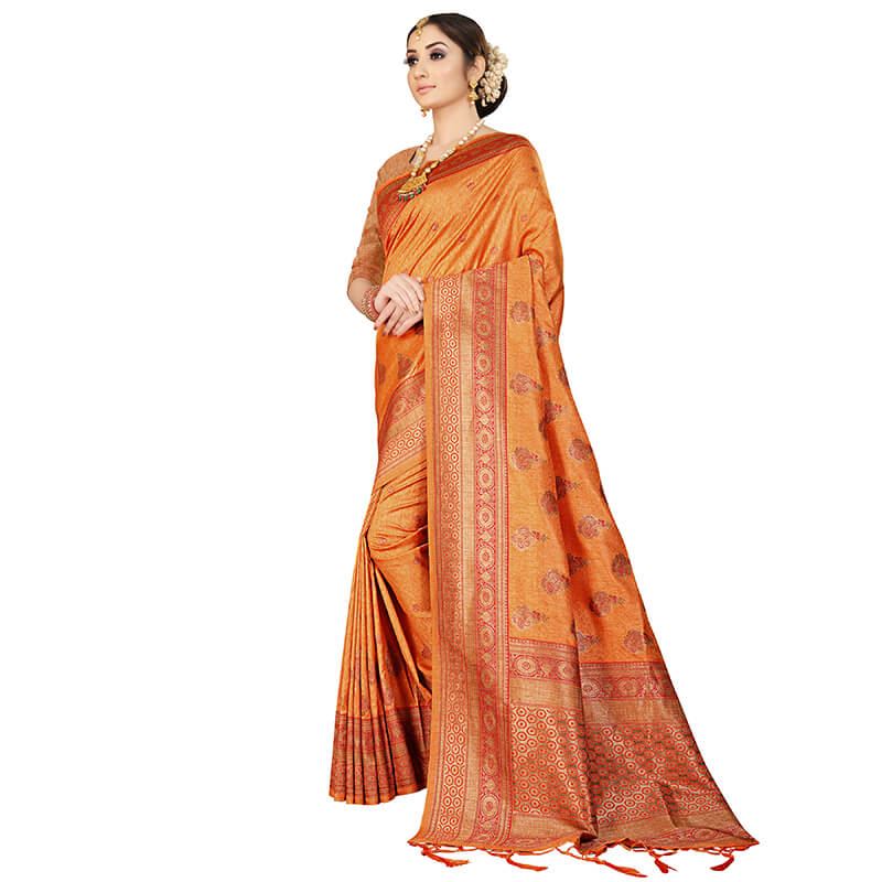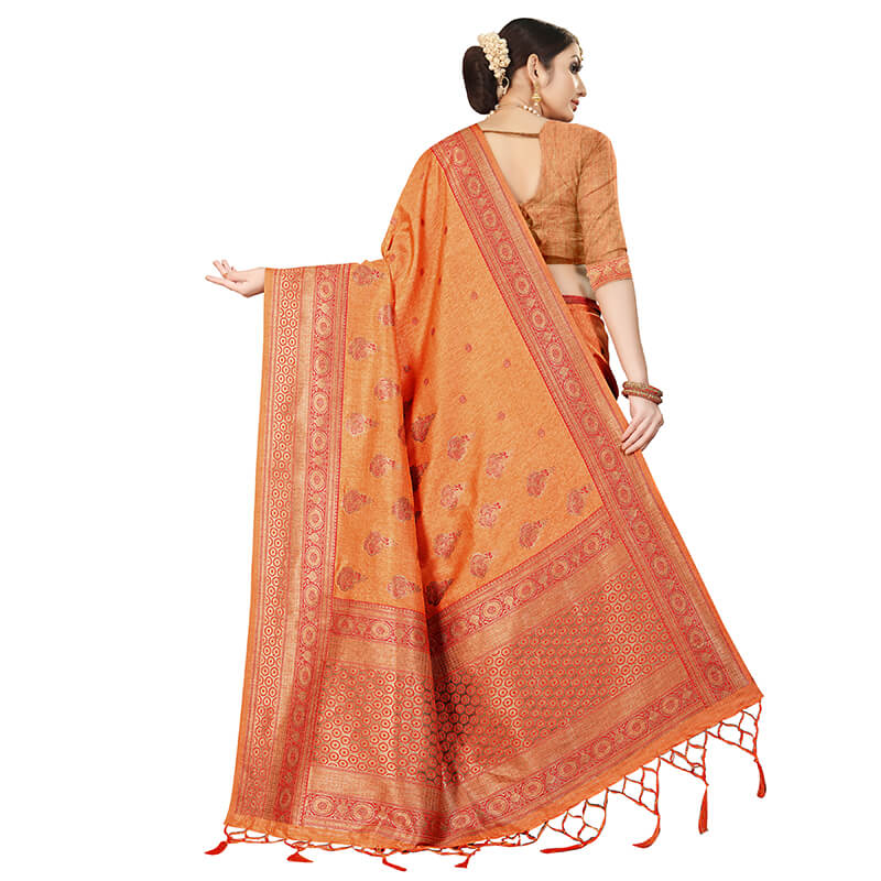 Orange And Red Paisley Pattern Zari Jacquard Borderd Art Tussar Silk Premium Saree With Tassels
