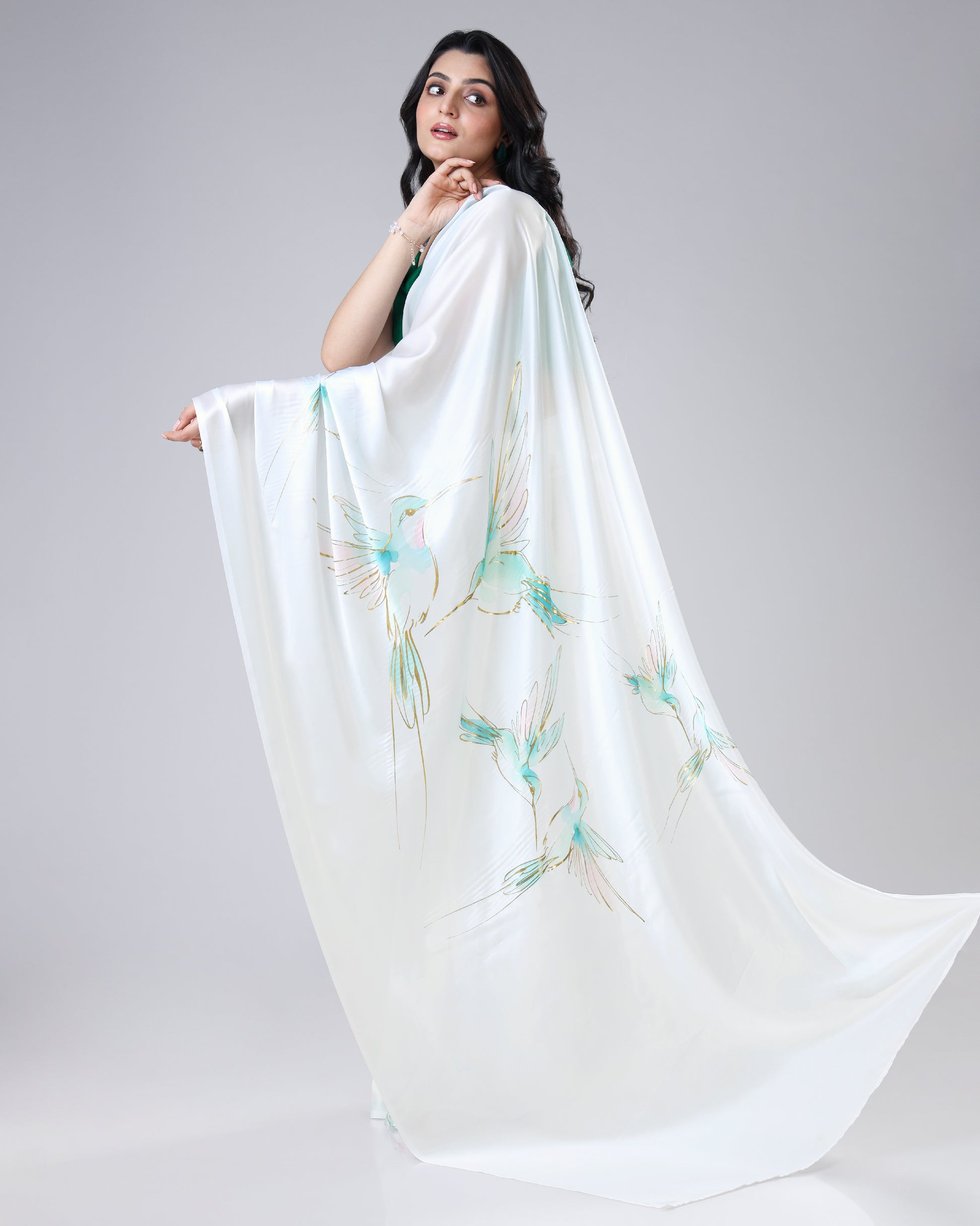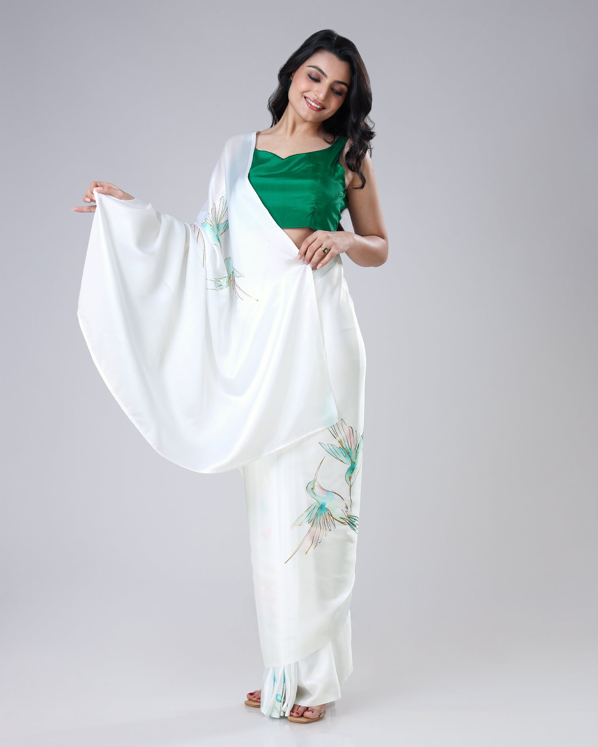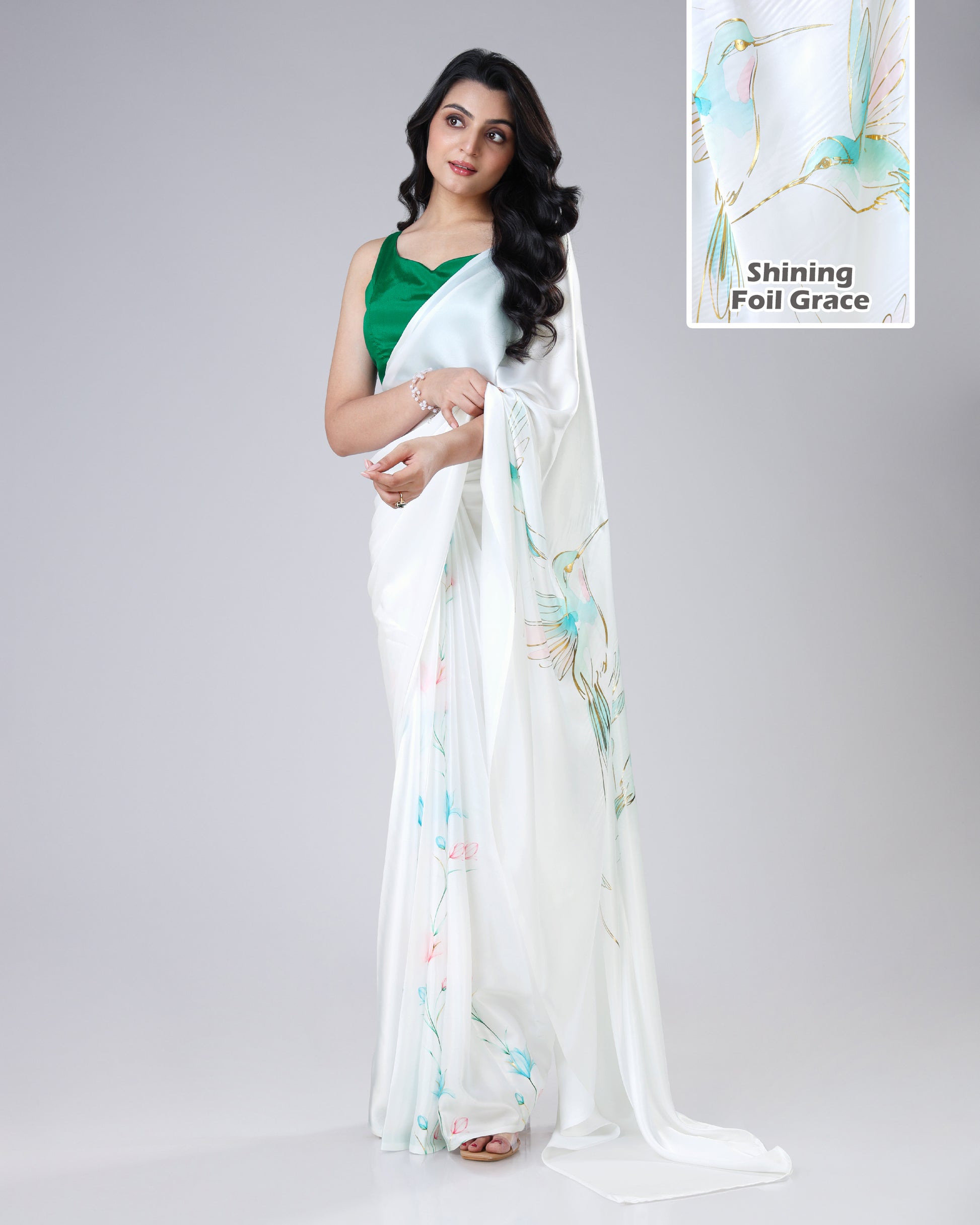 Indulge in luxury with this premium satin saree, crafted to drape you in elegance and comfort. The smooth satin fabric flows effortlessly, giving a radiant sheen with every move. Adorned with foil work on delicate prints, it brings a subtle shimmer that elevates your look for festive occasions, weddings, or evening soirees.