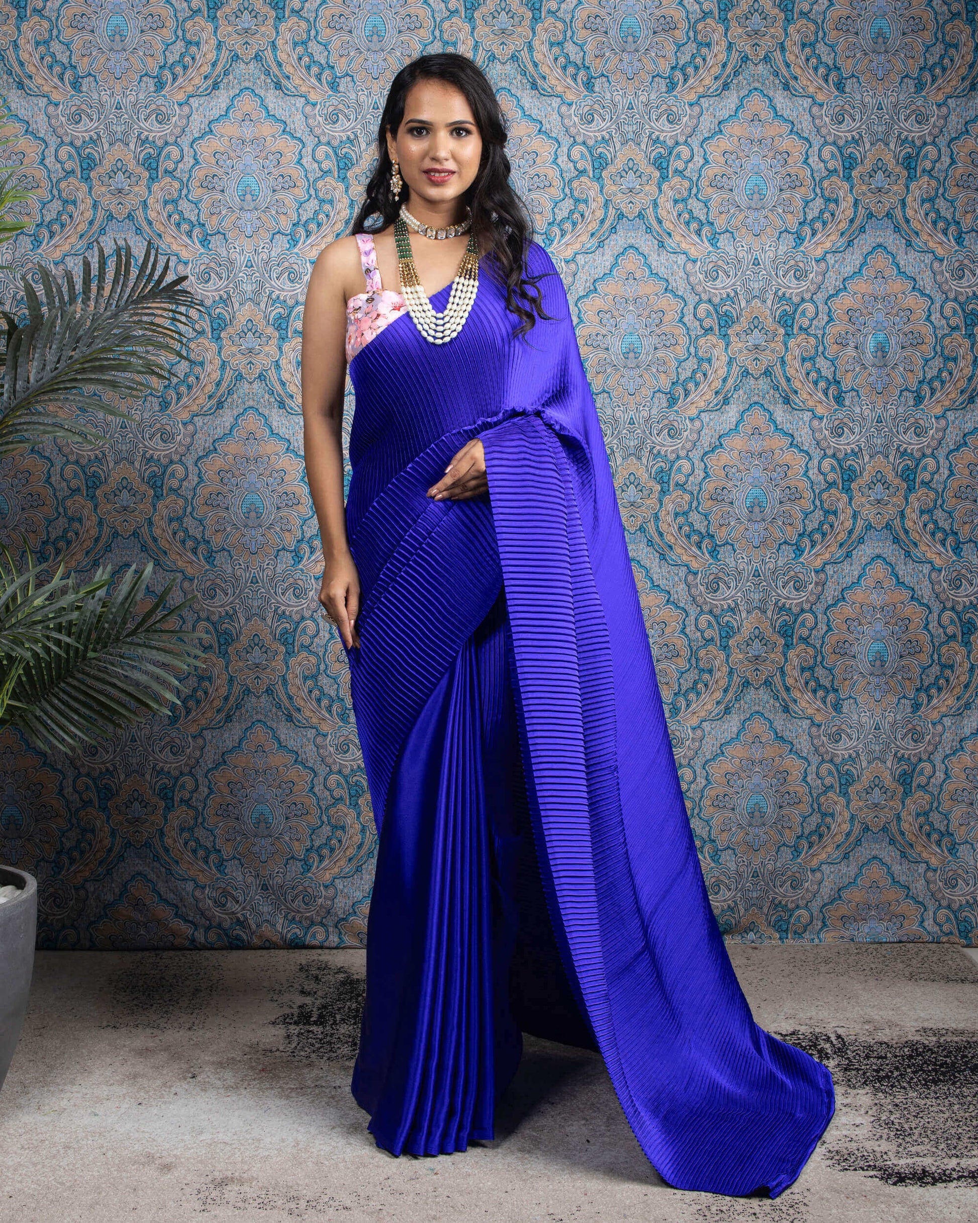 Royal Blue Plain Half Pleated Japan Satin Saree