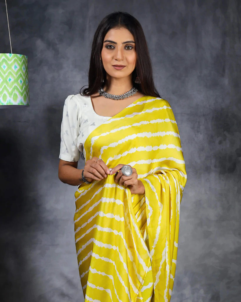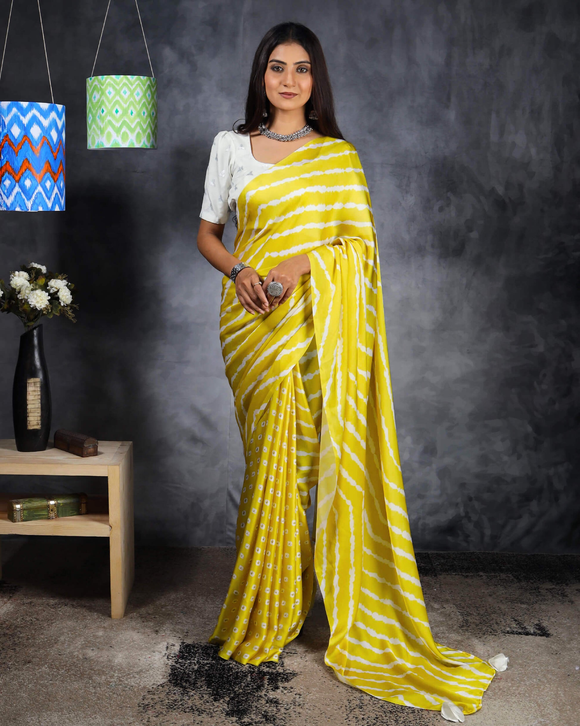 Royal Yellow And White Leheriya Pattern Digital Print Crepe Silk Saree With Tassels