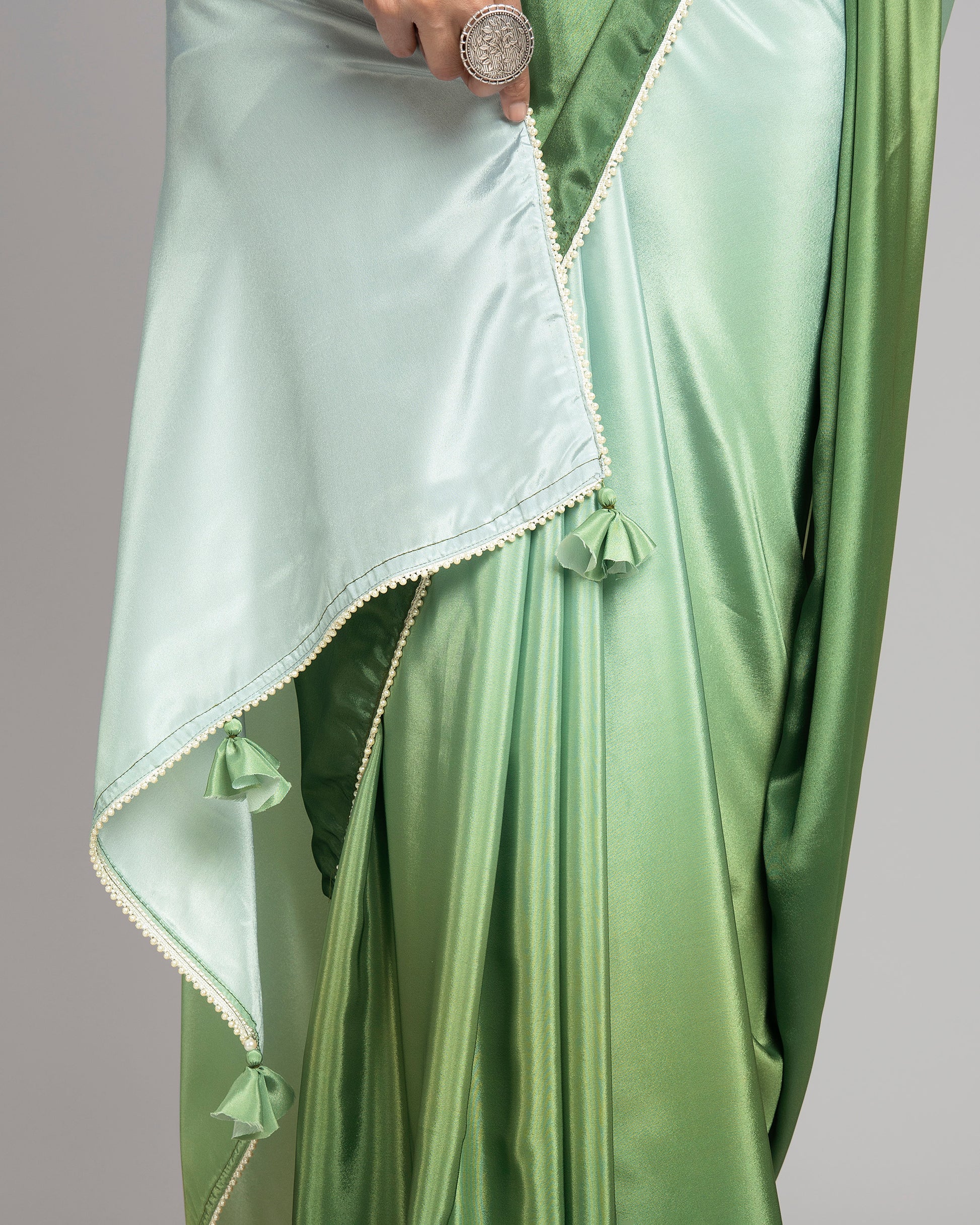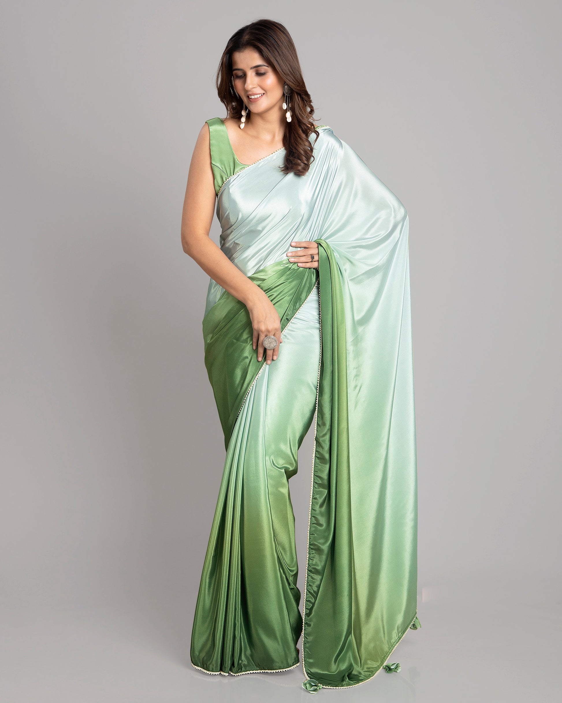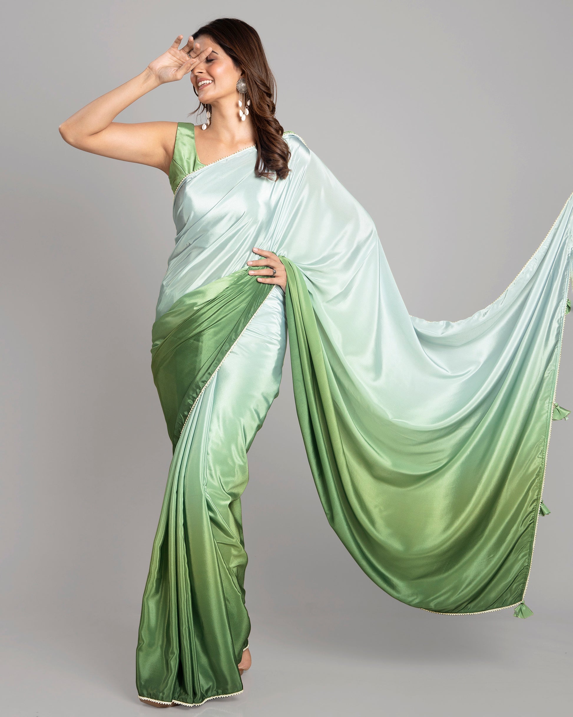 Up your style game with this exclusive designer saree! Made of gorgeous silk and featuring a stunning ombre design, you'll be ready to make a statement everywhere you go. Get ready to wow the crowd in this Bollywood-approved look!