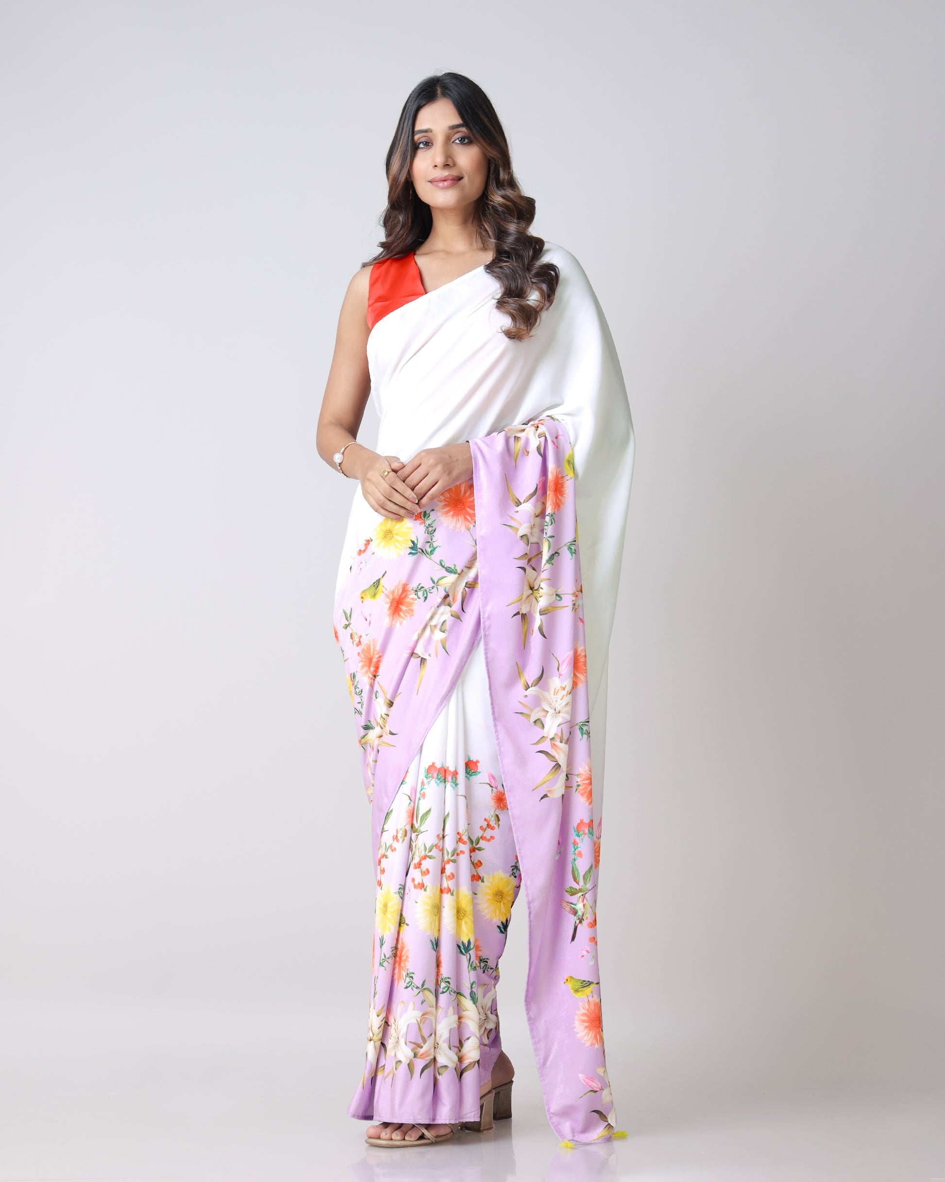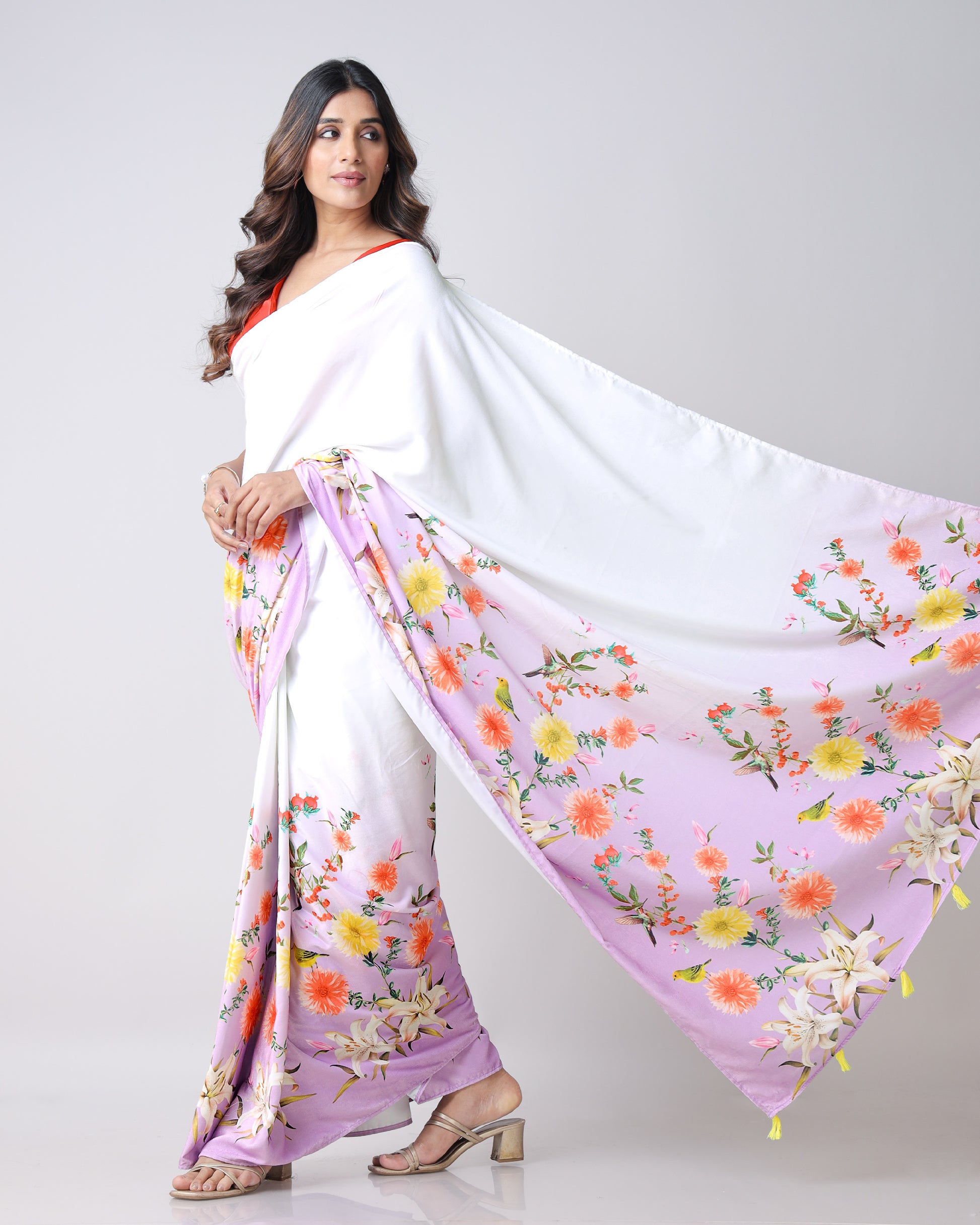 Velvet Pop: White Floral And Lilac Purple Ombrte Premium Velvet Saree