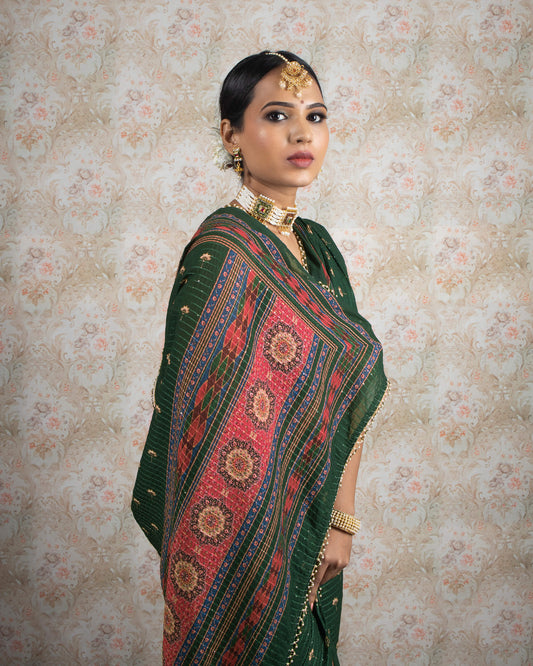 Moss Green Leheriya Pattern Digital Print Georgette Saree With Mirror Work Lace Border Moss Green Leheriya Pattern Digital Print Georgette Saree With Mirror Work Lace Border