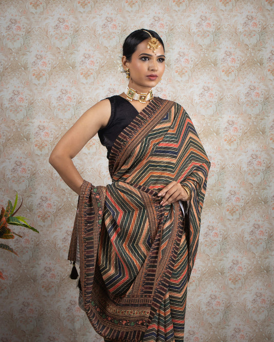Grass Green And Beige Leheriya Pattern Digital Print Georgette Saree With Golden Zari Lace Border Grass Green And Beige Leheriya Pattern Digital Print Georgette Saree With Golden Zari Lace Border