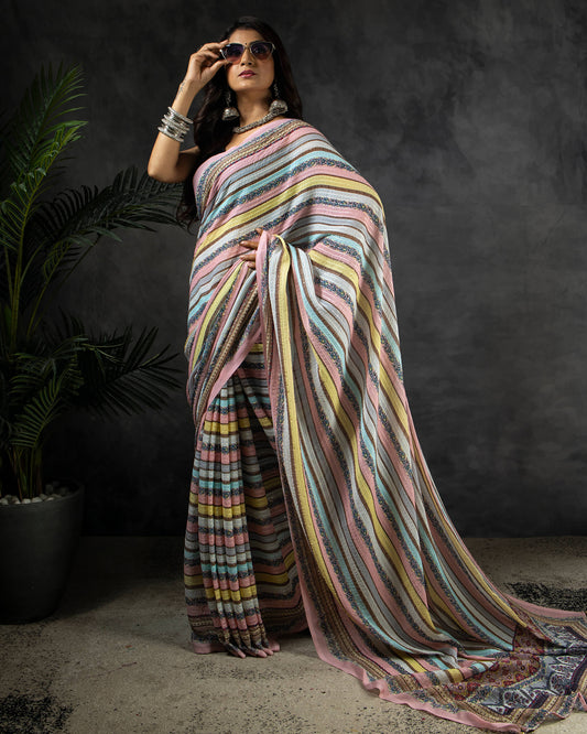 Multi-Color Stripes Pattern Premium Sequins Georgette Saree With Tassels Multi-Color Stripes Pattern Premium Sequins Georgette Saree With Tassels