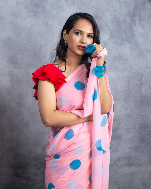 -25% offStrawberry Pink Polka Dots Digital Print Georgette Ruffle Saree Strawberry Pink Polka Dots Digital Print Georgette Ruffle Saree