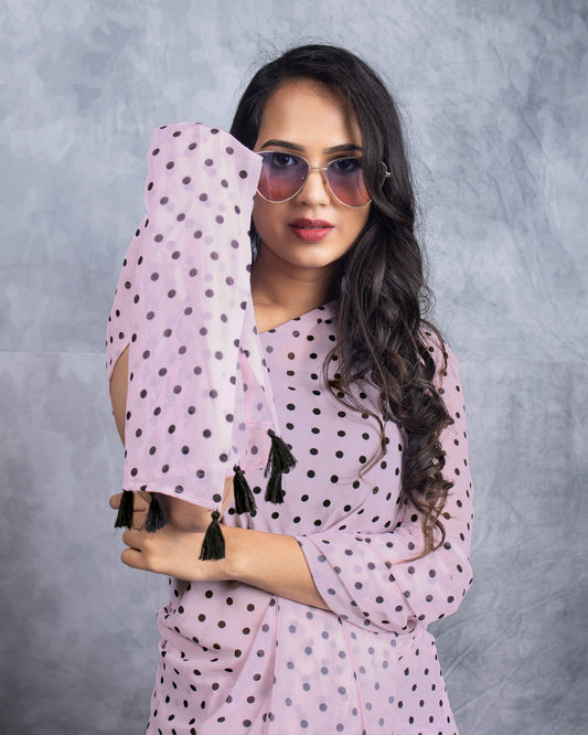 Pale Pink And Black Polka Dots Pattern Digital Print Georgette Saree With Tassels Pale Pink And Black Polka Dots Pattern Digital Print Georgette Saree With Tassels