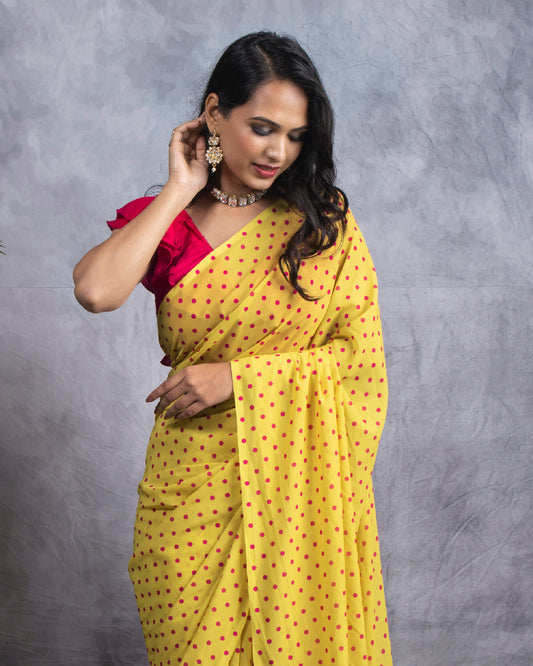 Bumblebee Yellow And Pink Polka Dots Pattern Digital Print Georgette Saree With Tassels Bumblebee Yellow And Pink Polka Dots Pattern Digital Print Georgette Saree With Tassels