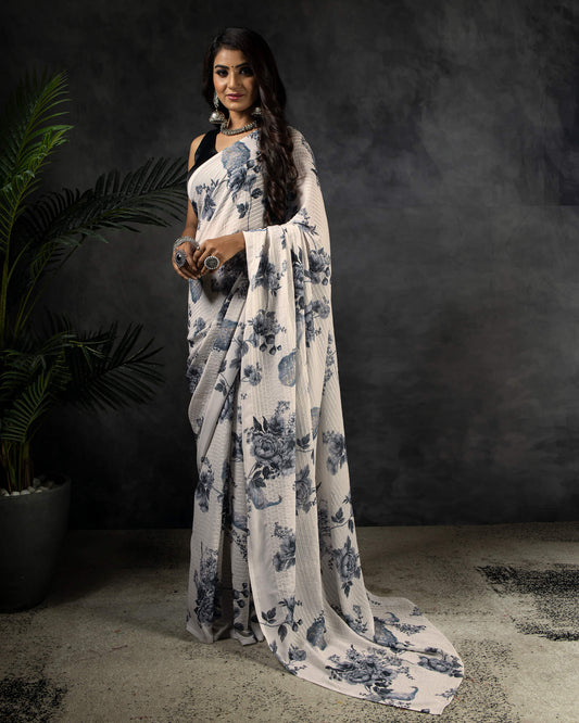 -20% offWhite And Black Polka Dots Pattern Digital Print Georgette Ruffle Saree White And Black Polka Dots Pattern Digital Print Georgette Ruffle Saree
