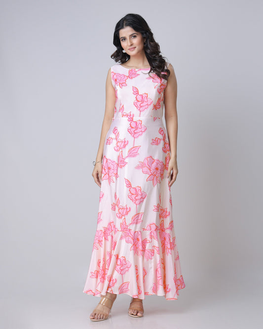 Beautiful White And Pink Floral Pre-Draped Gown Saree For Festive Season Beautiful White And Pink Floral Pre-Draped Gown Saree For Festive Season