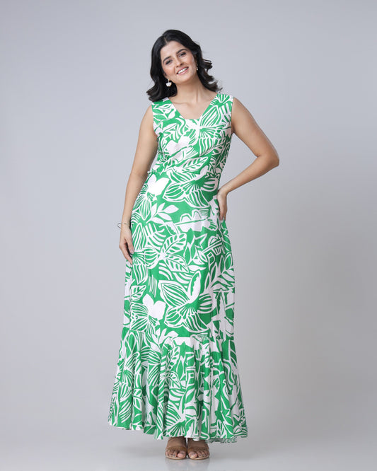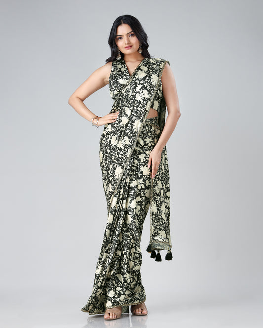 Green And White Abstract Floral Pre-Draped Gown Saree Green And White Abstract Floral Pre-Draped Gown Saree