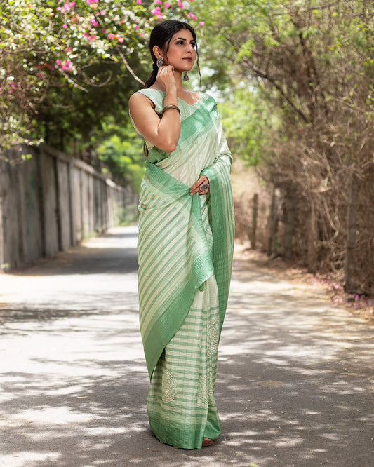 Pistachio Green And White Ethnic Pattern Digital Print Art Tusser Silk Saree With Tassels Pistachio Green And White Ethnic Pattern Digital Print Art Tusser Silk Saree With Tassels