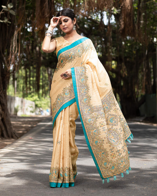 Ecru Beige And Navy Blue Madhuvanii Pattern Digital Print Art Tusser Silk Saree With Tassels Ecru Beige And Navy Blue Madhuvanii Pattern Digital Print Art Tusser Silk Saree With Tassels