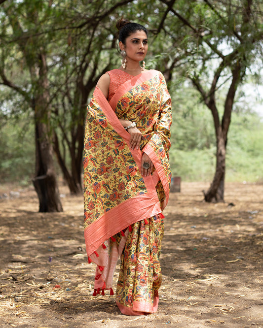 Tuscany Yellow And Coral Peach Floral Pattern Digital Print Art Tusser Silk Saree With Tassels Tuscany Yellow And Coral Peach Floral Pattern Digital Print Art Tusser Silk Saree With Tassels