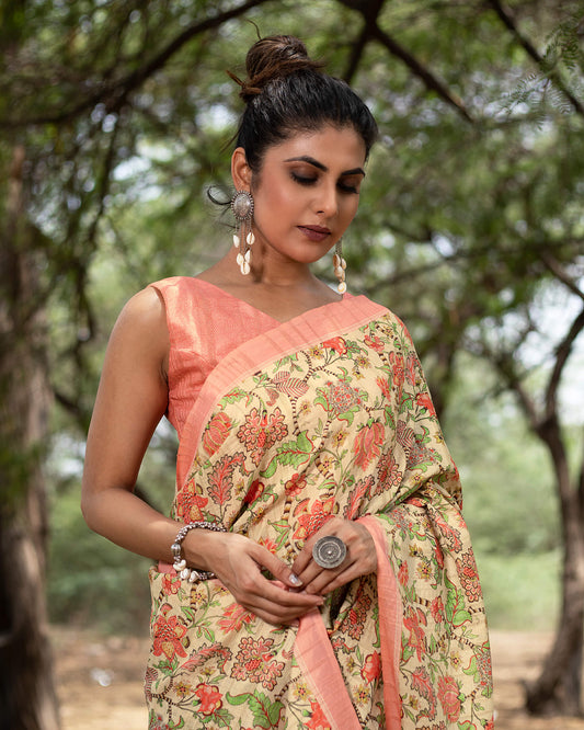 Peach And Ecru Beige Floral Pattern Digital Print Art Tusser Silk Saree With Tassels Peach And Ecru Beige Floral Pattern Digital Print Art Tusser Silk Saree With Tassels