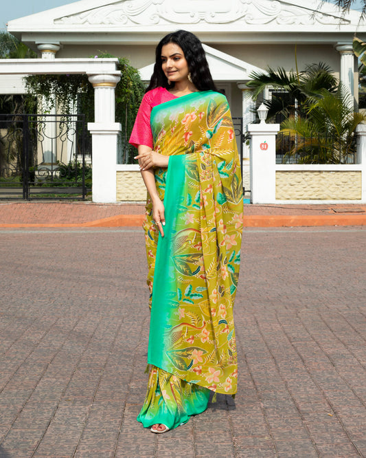 -27% offOlive Green And Pink Floral Pattern Digital Print Georgette Saree With Tassels Olive Green And Pink Floral Pattern Digital Print Georgette Saree With Tassels