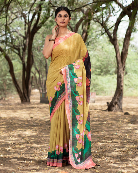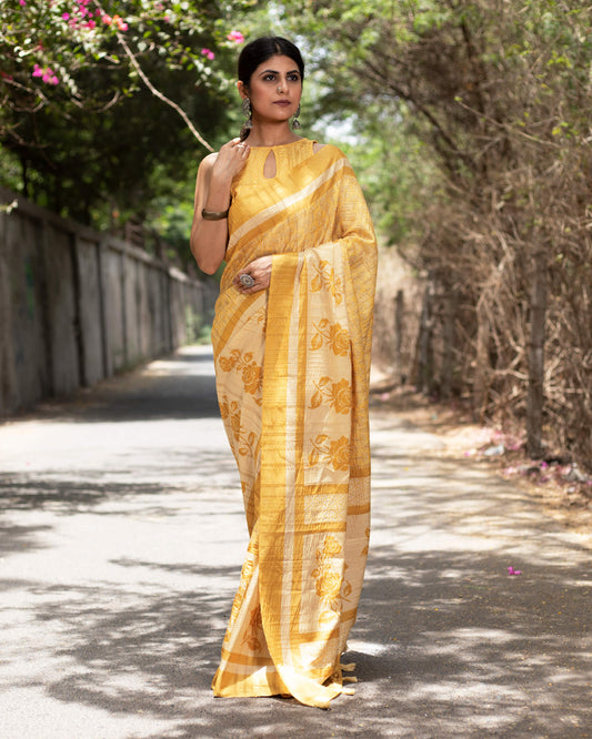 Flaxen Yellow And Oat Beige Floral Pattern Digital Print Art Tusser Silk Saree With Tassels Flaxen Yellow And Oat Beige Floral Pattern Digital Print Art Tusser Silk Saree With Tassels
