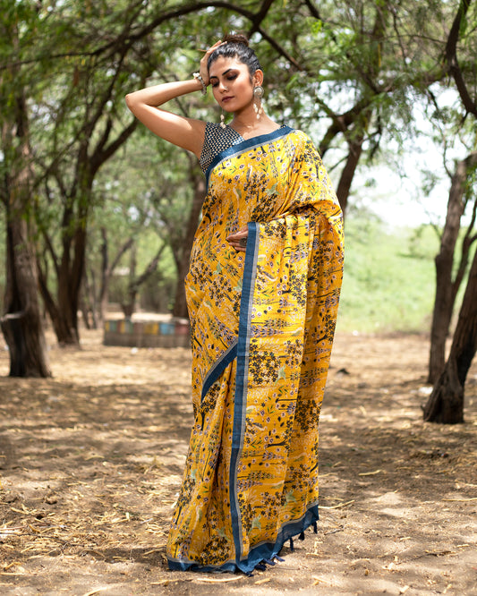Medallion Yellow And Green Floral Pattern Digital Print Art Tusser Silk Saree With Tassels Medallion Yellow And Green Floral Pattern Digital Print Art Tusser Silk Saree With Tassels
