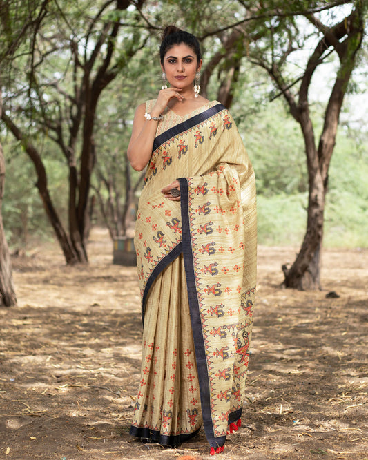 Ecru Beige And Burnt Orange Madhuvanii Pattern Digital Print Art Tusser Silk Saree With Tassels Ecru Beige And Burnt Orange Madhuvanii Pattern Digital Print Art Tusser Silk Saree With Tassels