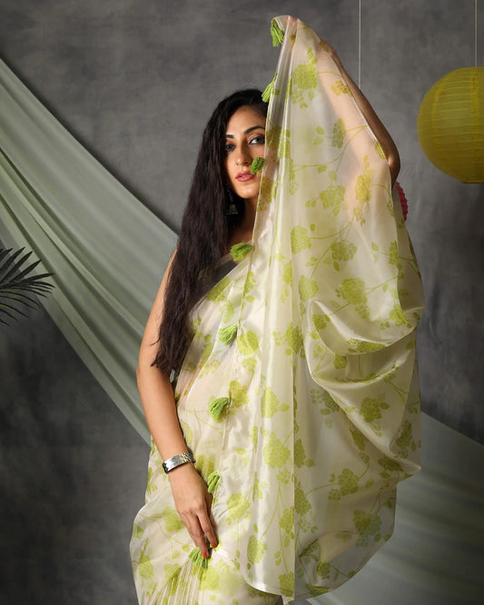 -12% offMoss Green And Off White Floral Pattern Organza Saree With Tassels Moss Green And Off White Floral Pattern Organza Saree With Tassels
