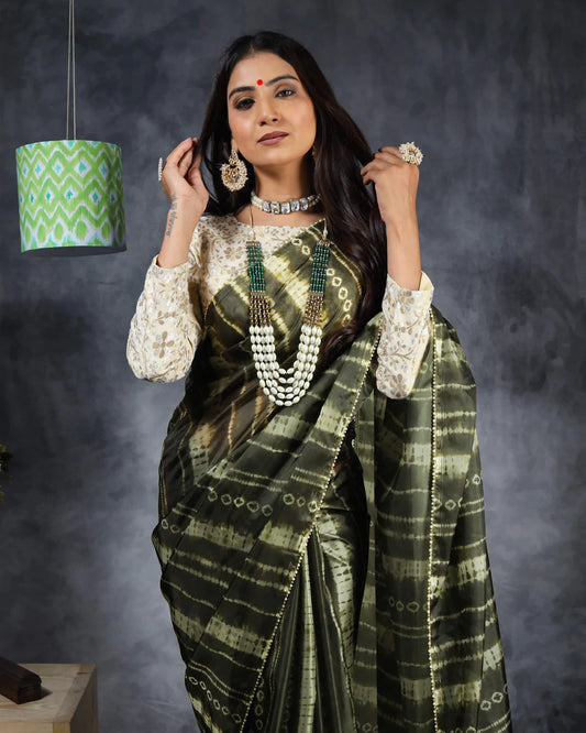 Army Green And White Shiiborii Pattern Organza Satin Saree With Pearl Work Lace Border Army Green And White Shiiborii Pattern Organza Satin Saree With Pearl Work Lace Border