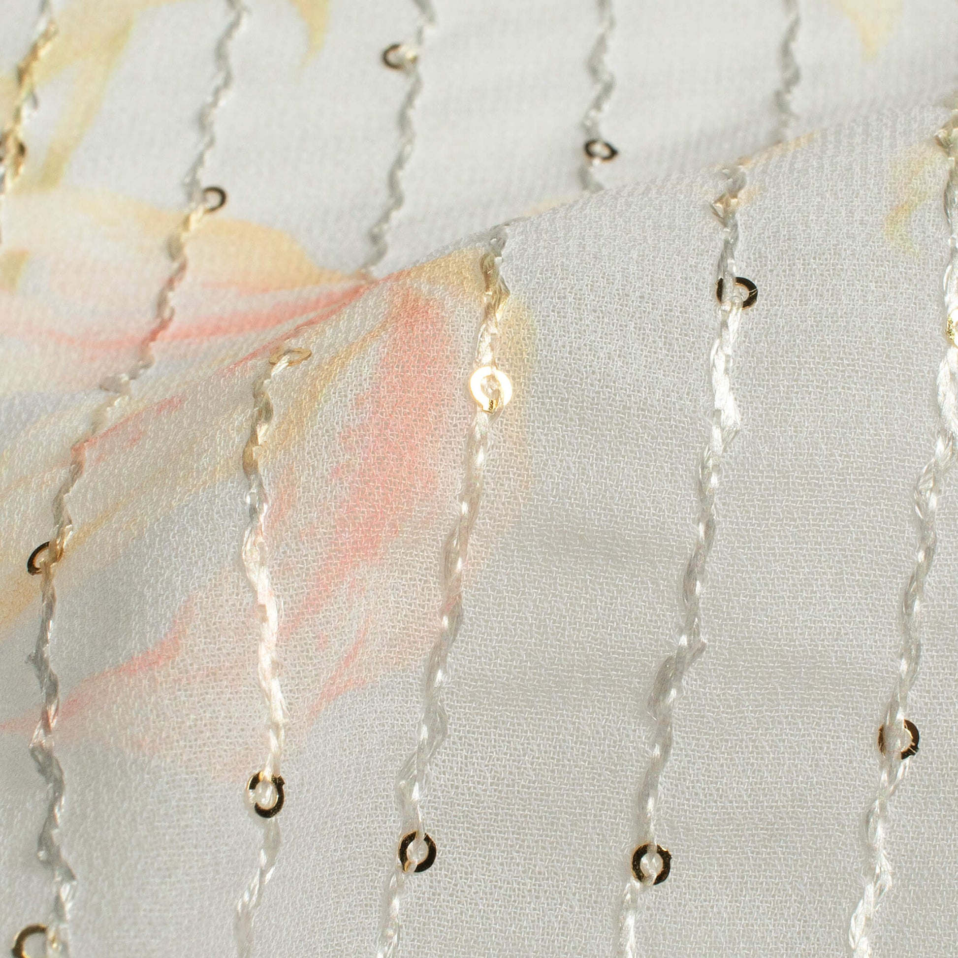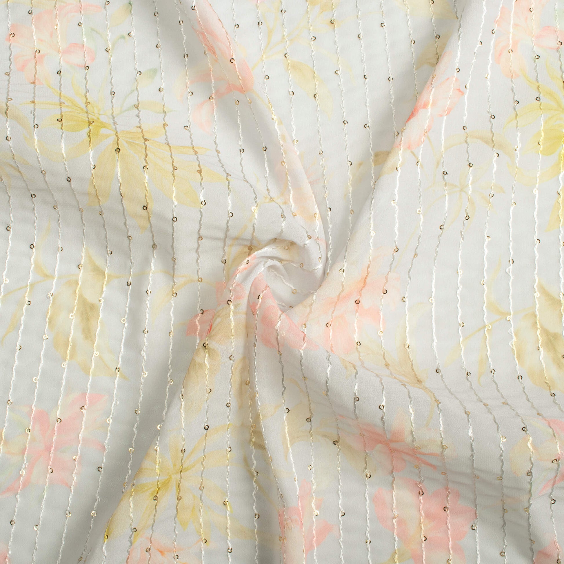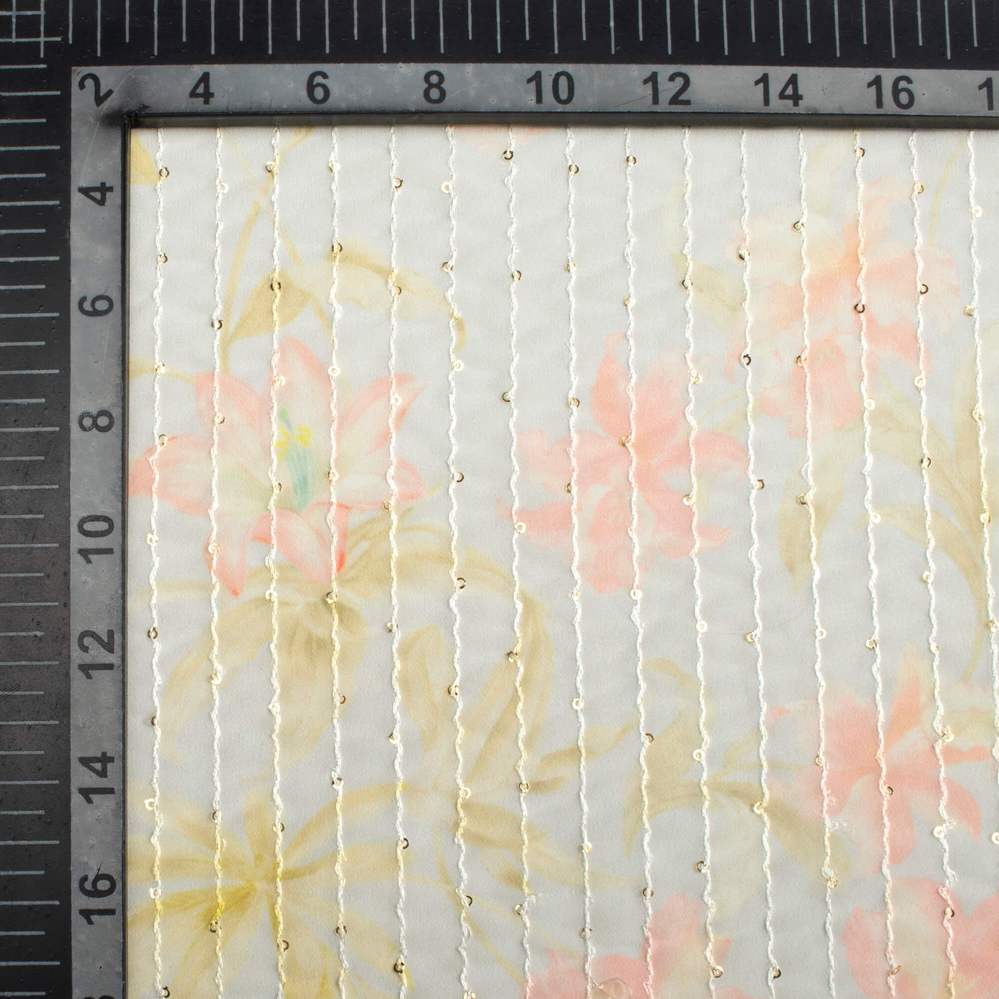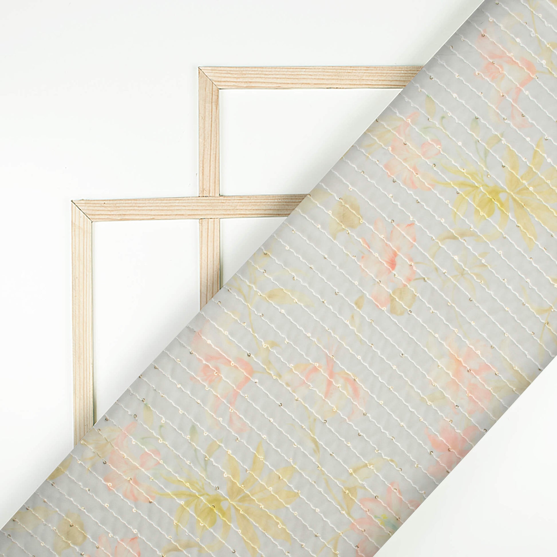 Dolphin Grey And Baby Pink Floral Pattern Digital Print Premium Sequins Georgette Fabric