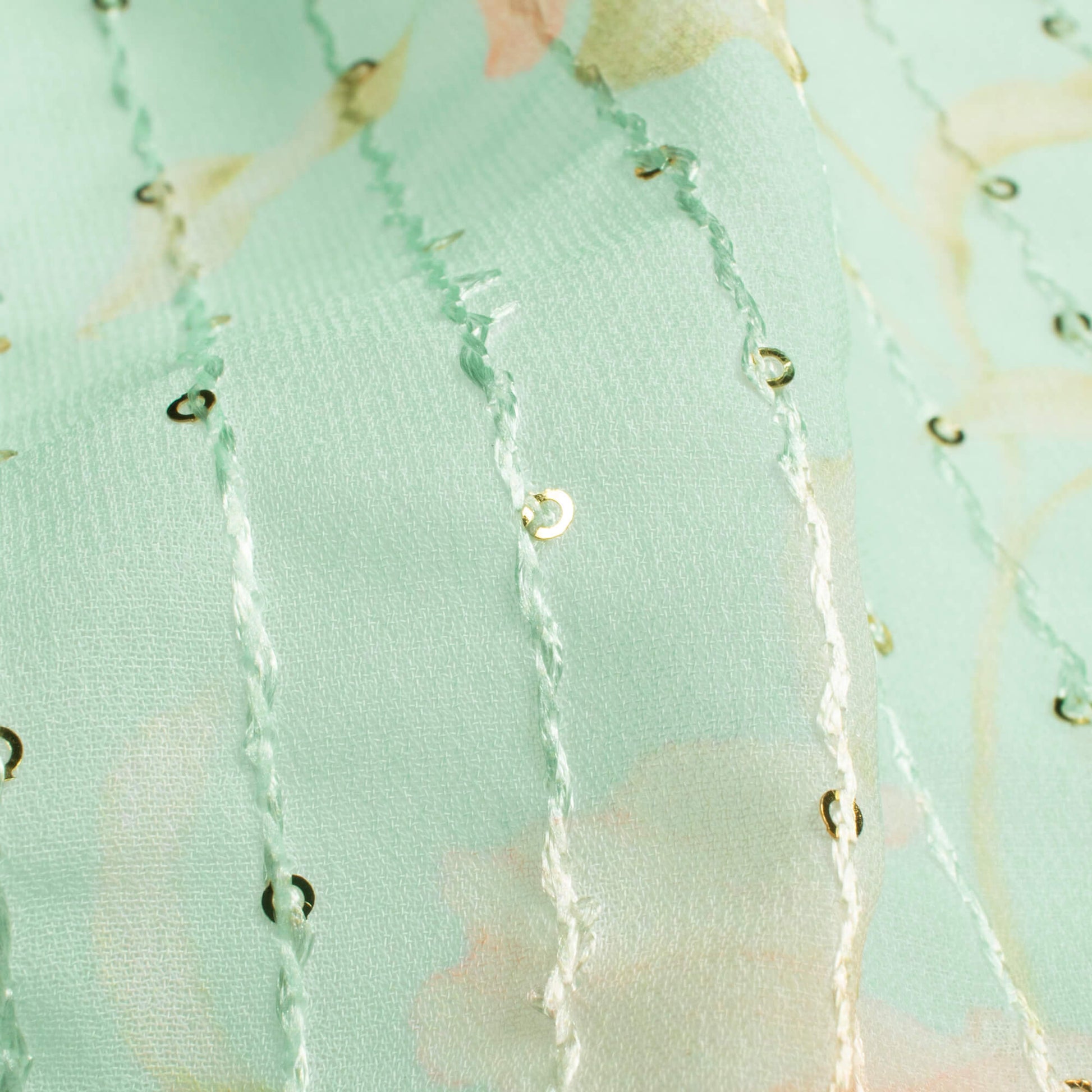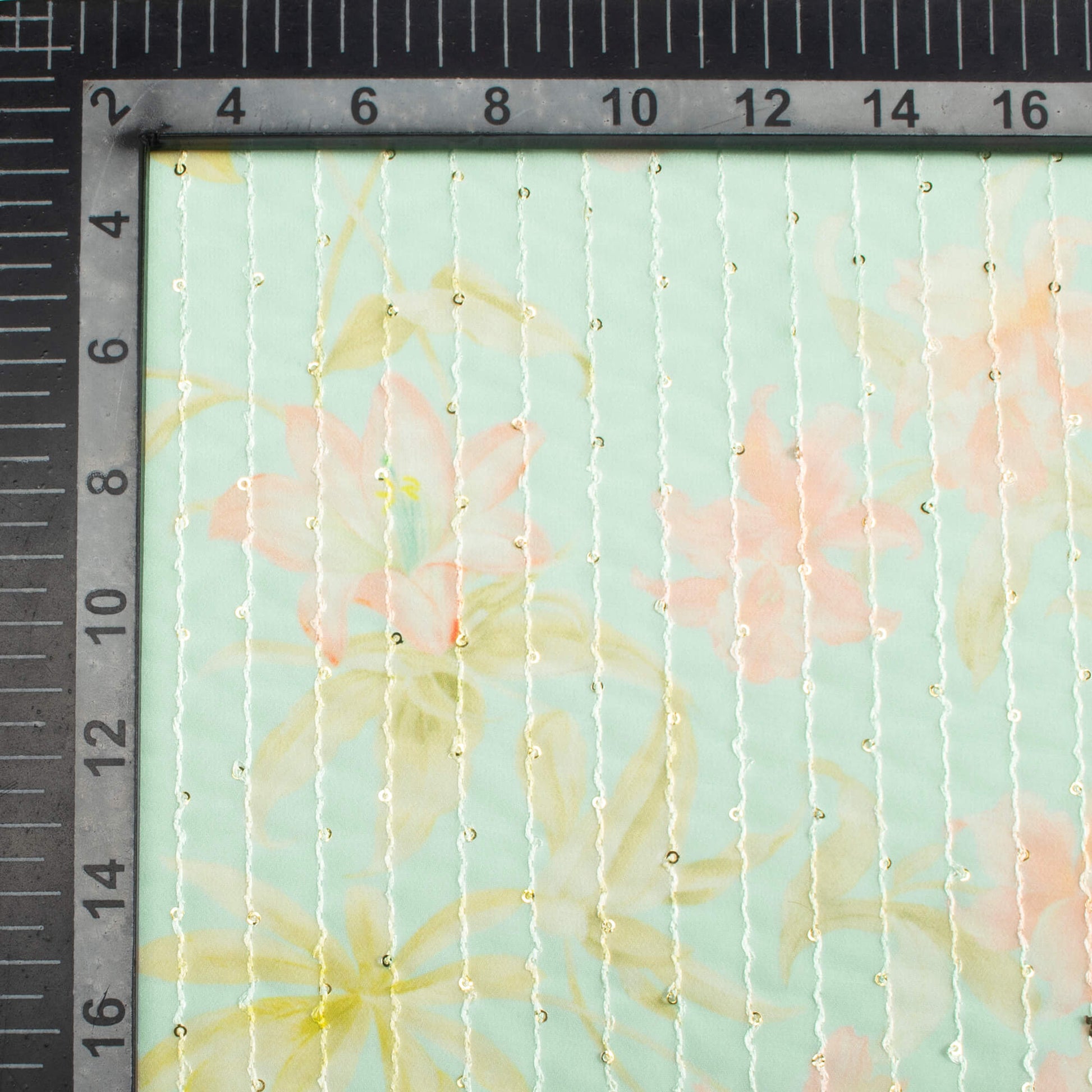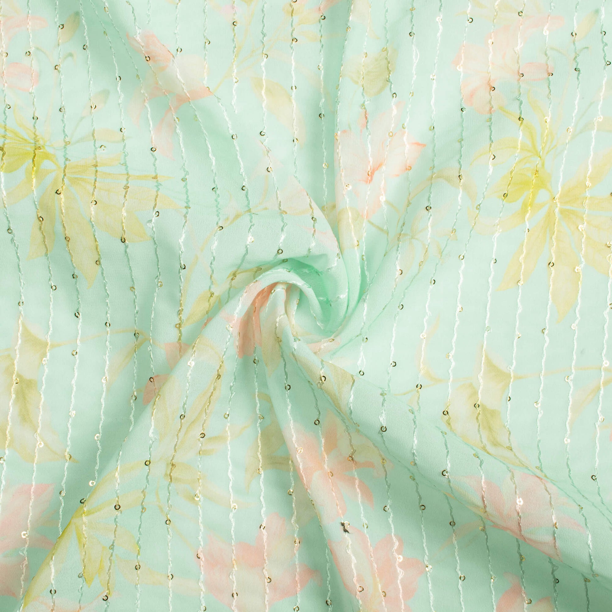 Mint Green And Baby Pink Floral Pattern Digital Print Premium Sequins Georgette Fabric