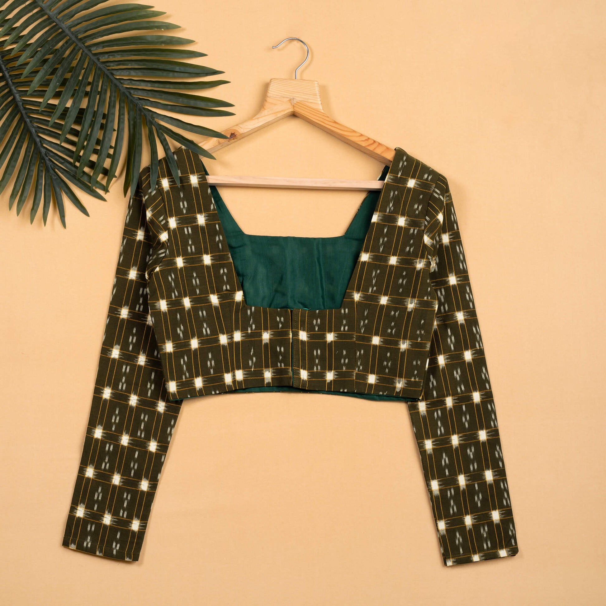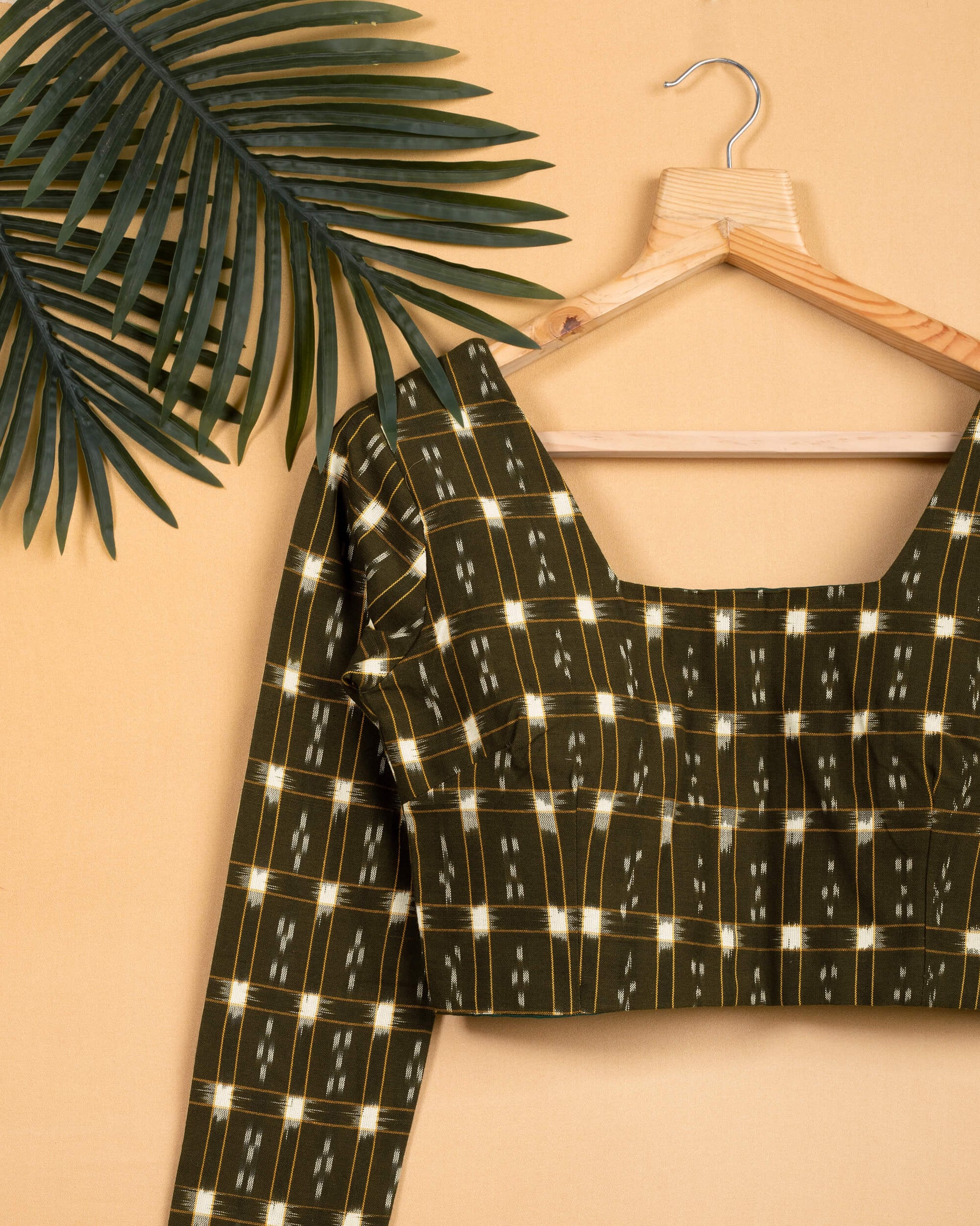 Ikat Cotton Blouse in checks pattern looks wonderful. It features Square neckline and is full sleeve. The fabric is soft and lightweight making it comfortable to wear. Suit this blouse with a saree and arrive in style.