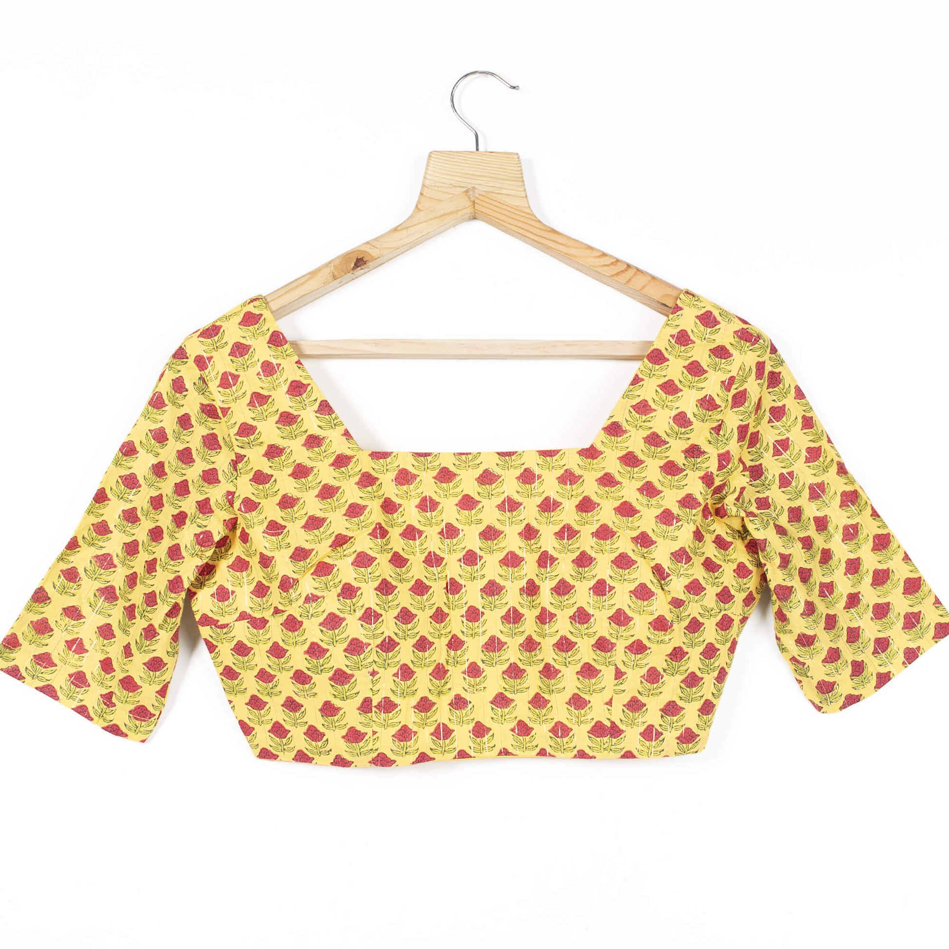 Cotton Lurex Blouse features half sleeves and has a Square-neckline with a back hook closure. Hand block work looks extra-ordinary on this fabric.This fabric is comfortable for summer season and is breathable. This blouse matched with the perfect saree brings out the best look in you.