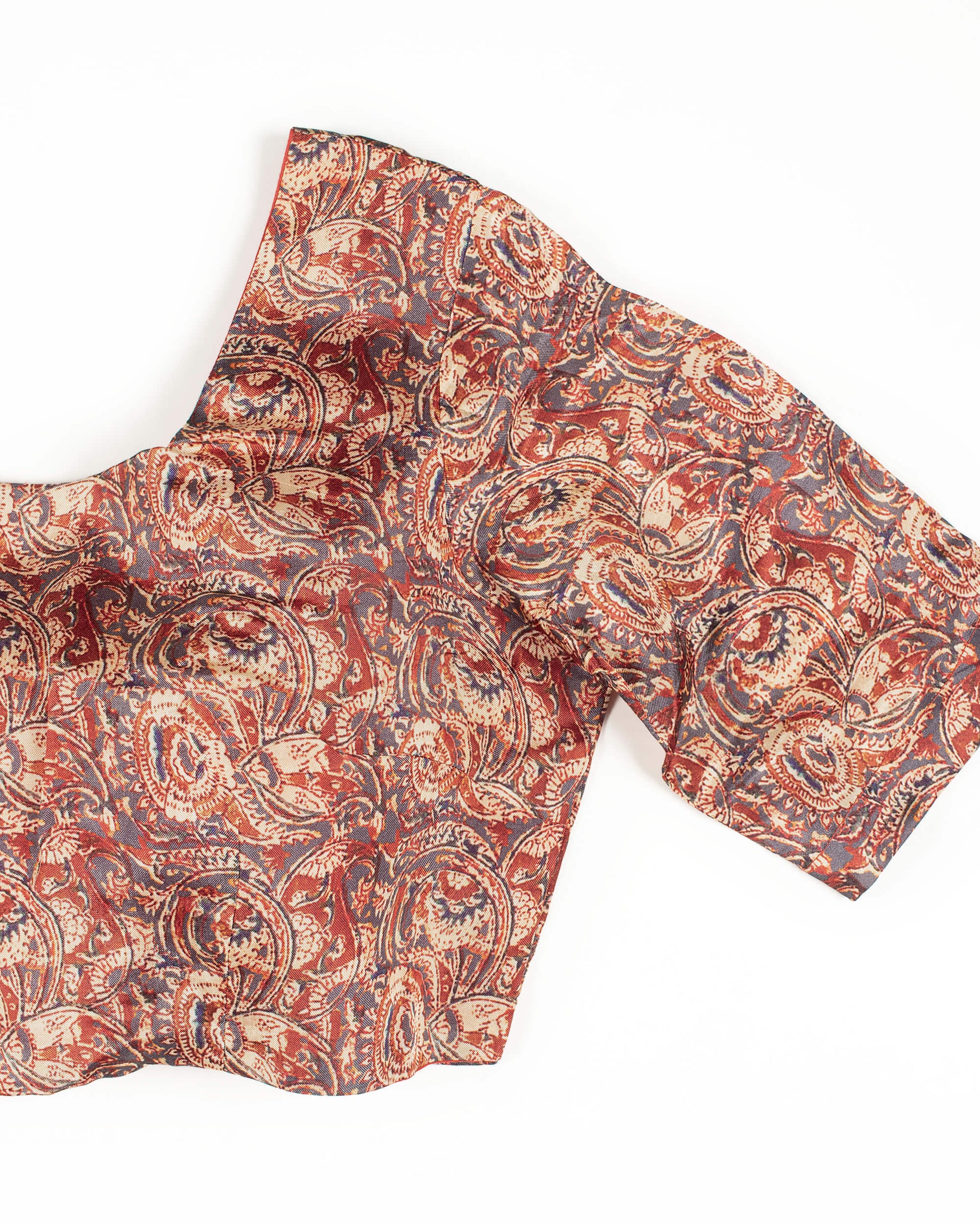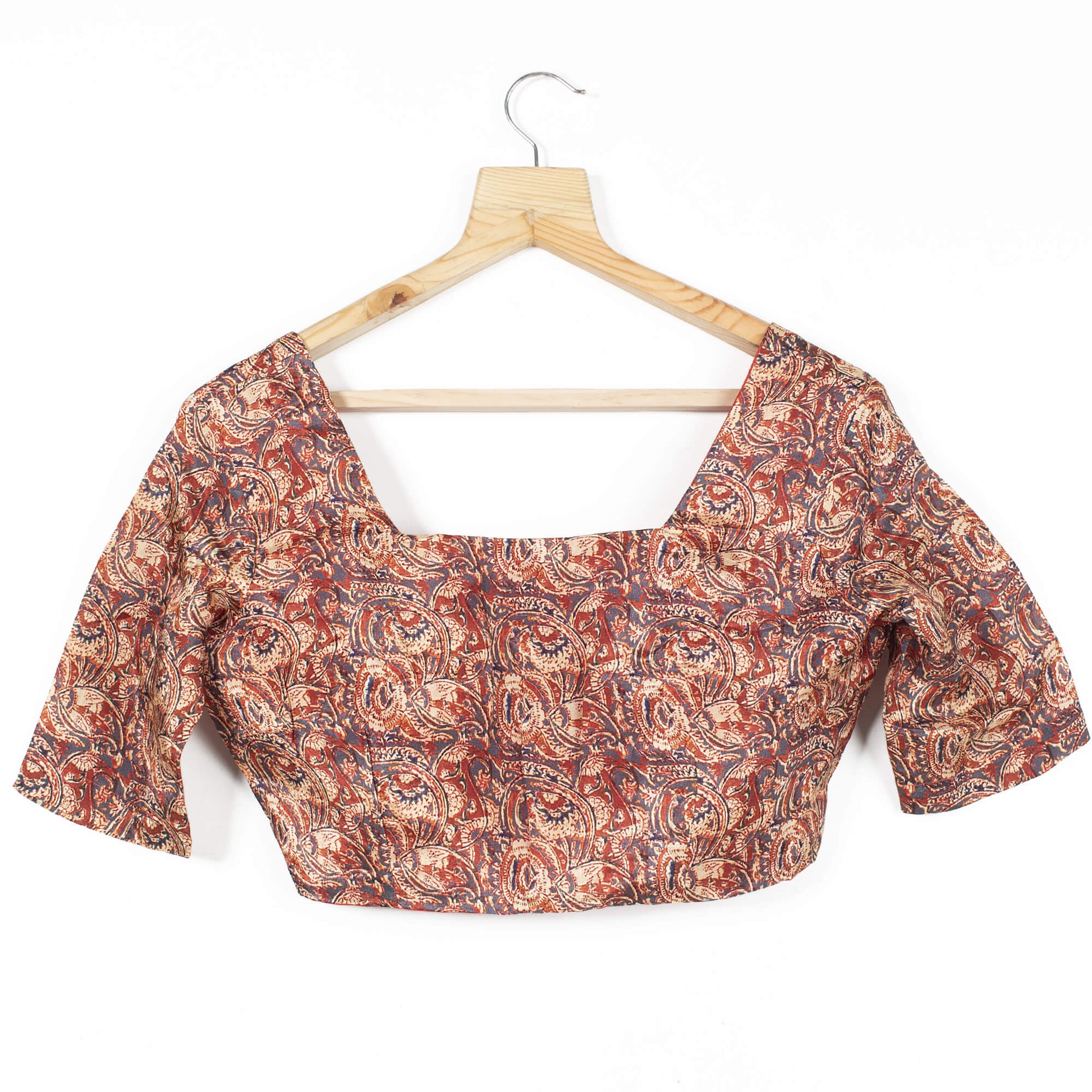 Viscose Uppada silk blouse is short sleeve and has a square neckline with a back hook closure.The patternn formed on the blouse appears fabulous.This fabric is soft, breathable and maintains shape.Match this blouse with a saree to give yourself a fashion treat.