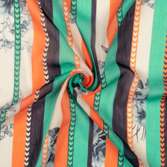Ocean Green And Carrot Orange Stripes Pattern Digital Print Chiffon Fabric Ocean Green And Carrot Orange Stripes Pattern Digital Print Chiffon Fabric