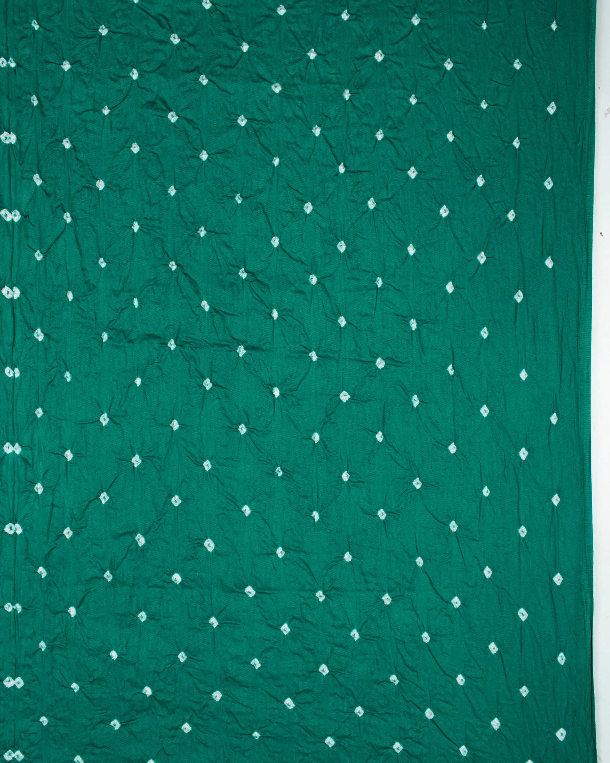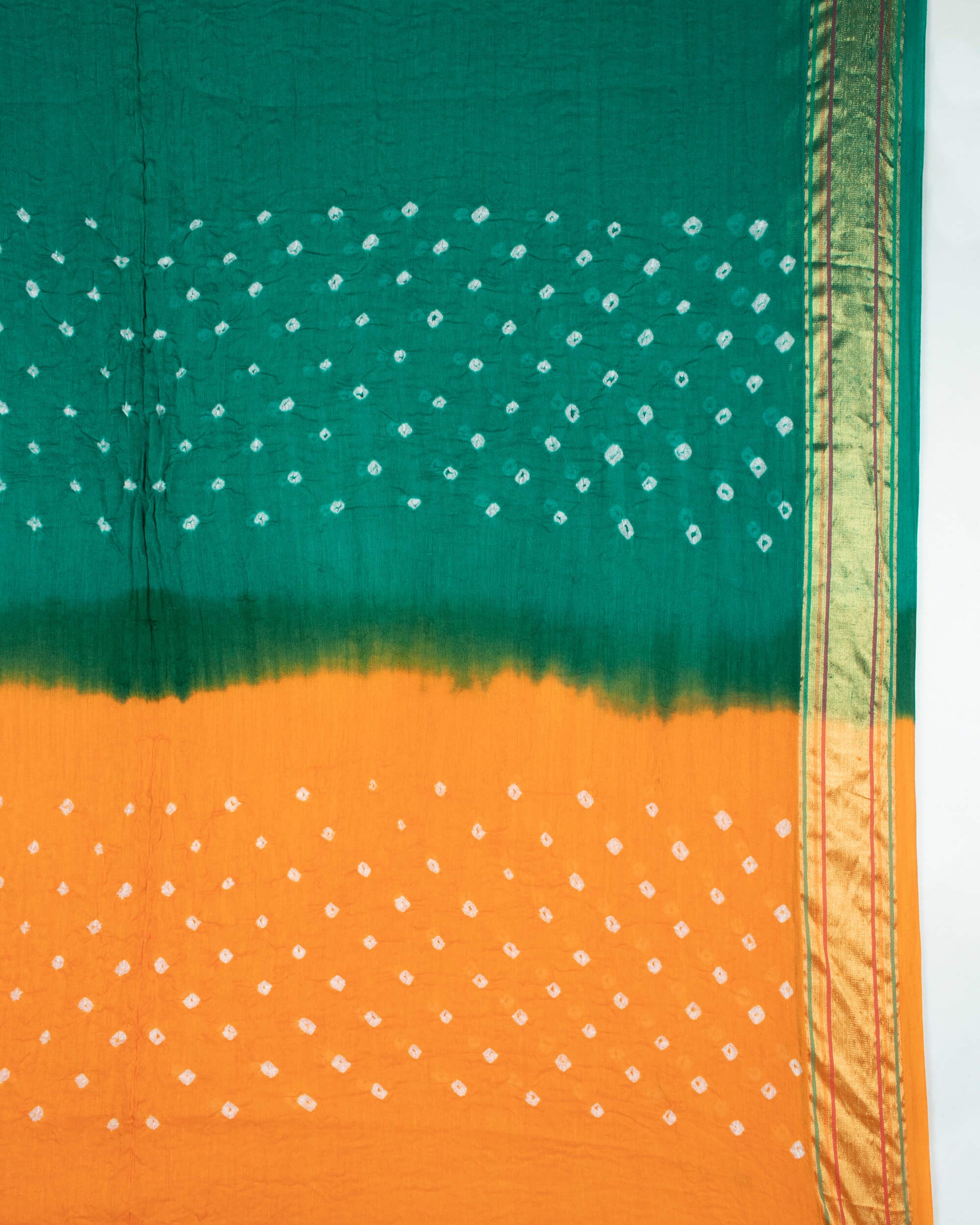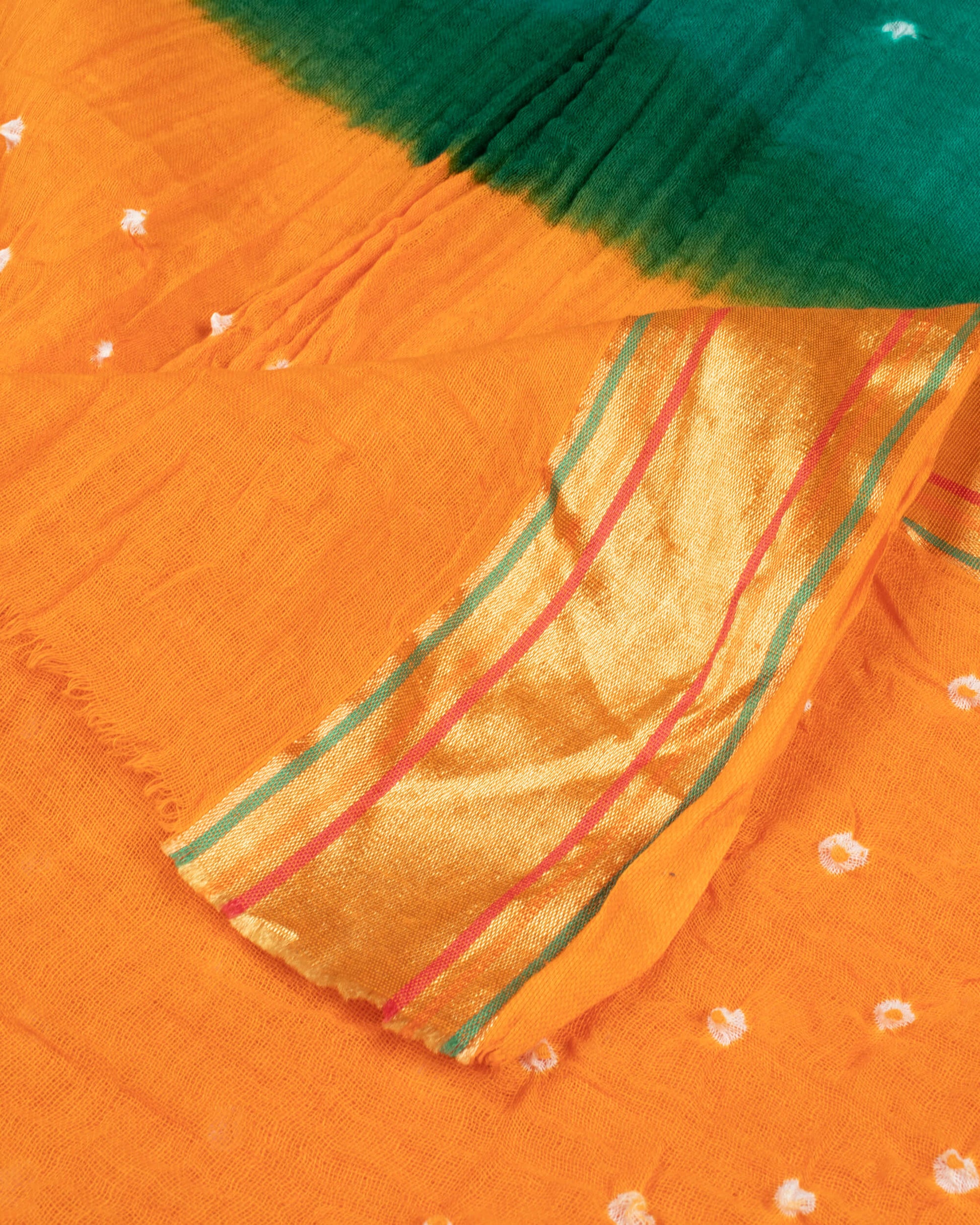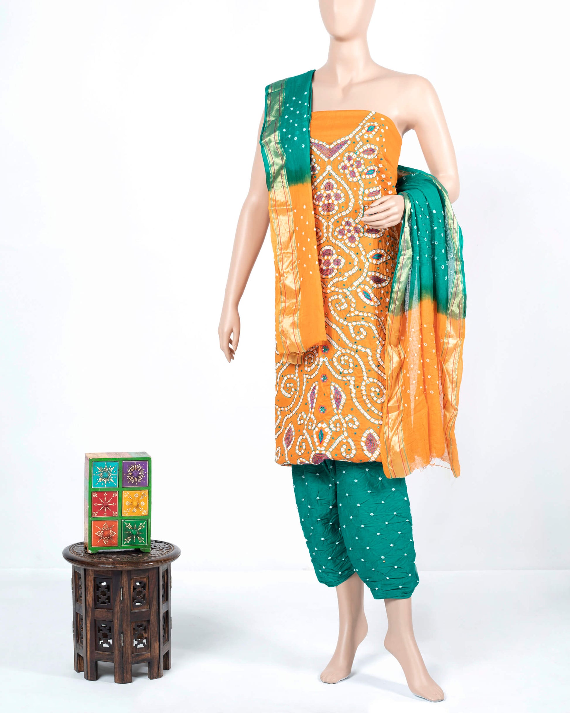 Honey Yellow And Green Kutchi Bandhani Foil Mirror Work Unstitched Cotton Suit With Zari Border Dupatta