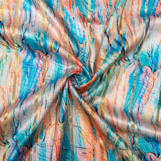 Deep Sky Blue And Charm Pink Shiiborii Pattern Digital Print Golden Lurex Satin Fabric Deep Sky Blue And Charm Pink Shiiborii Pattern Digital Print Golden Lurex Satin Fabric