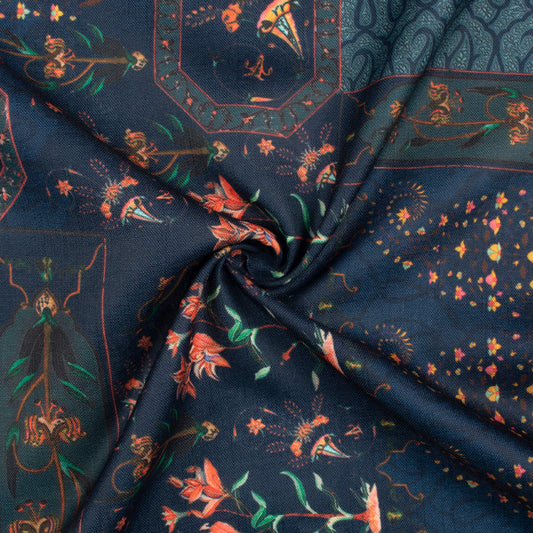 Dark Blue And Coral Peach Traditional Pattern Digital Print Viscose Muslin Fabric Dark Blue And Coral Peach Traditional Pattern Digital Print Viscose Muslin Fabric