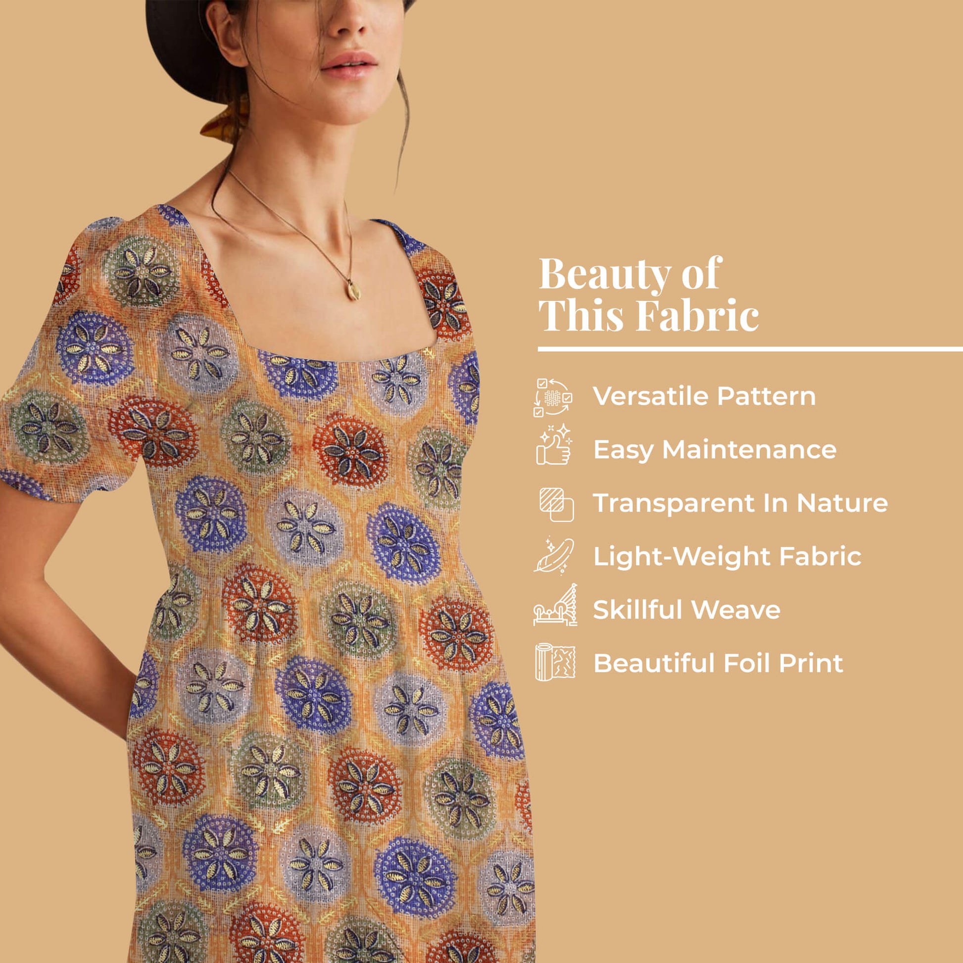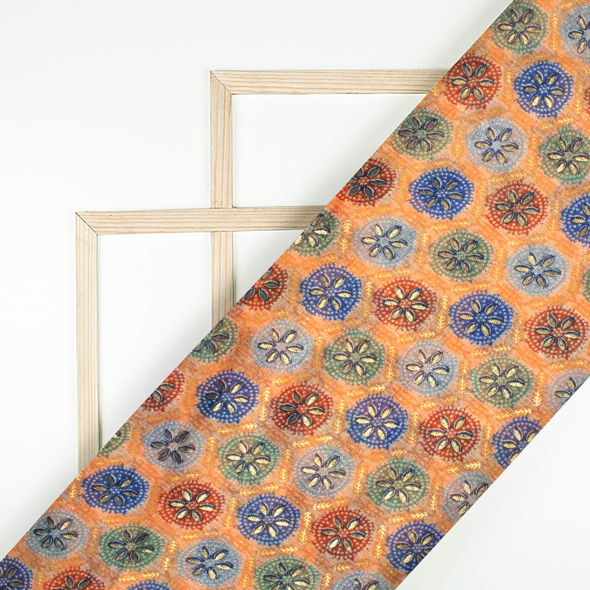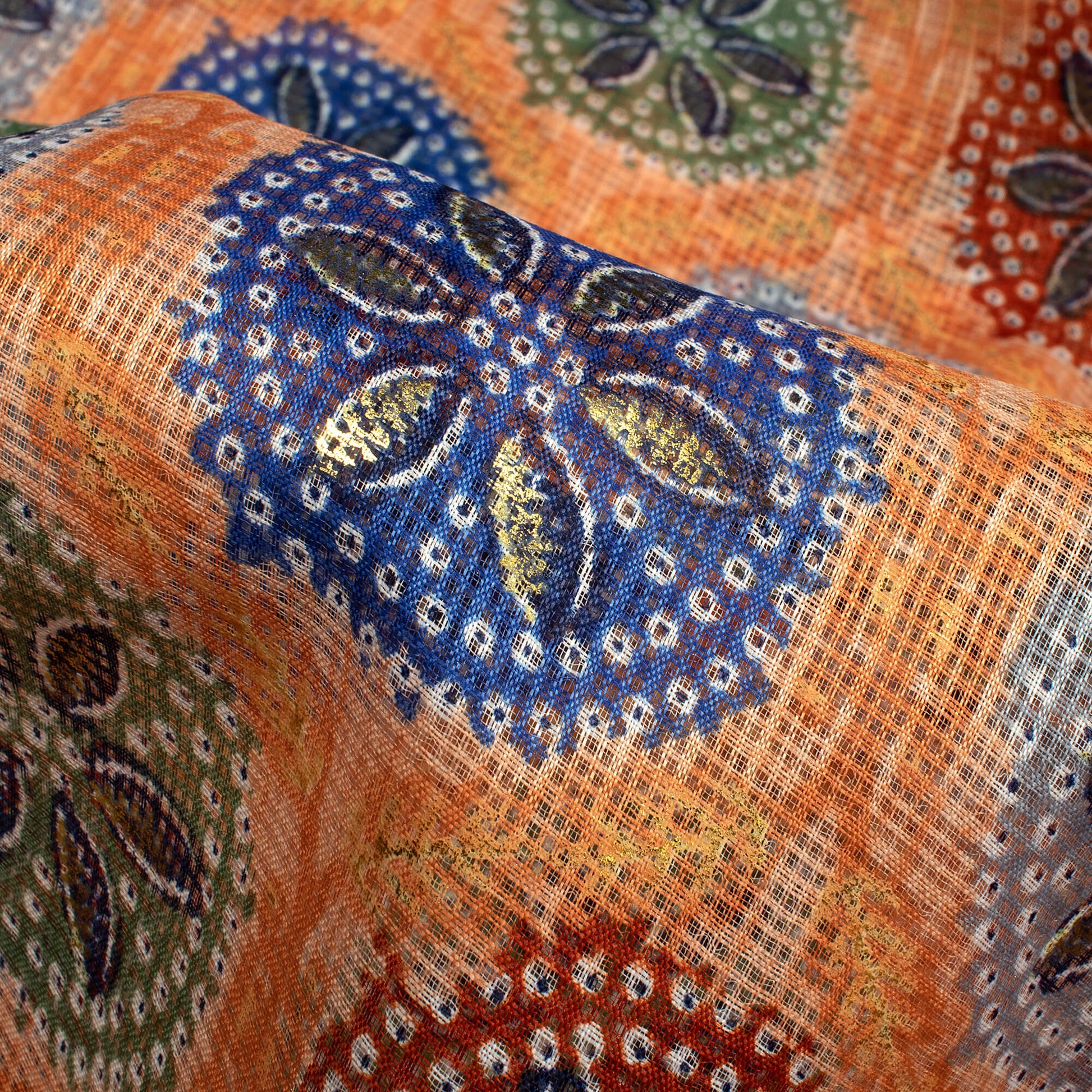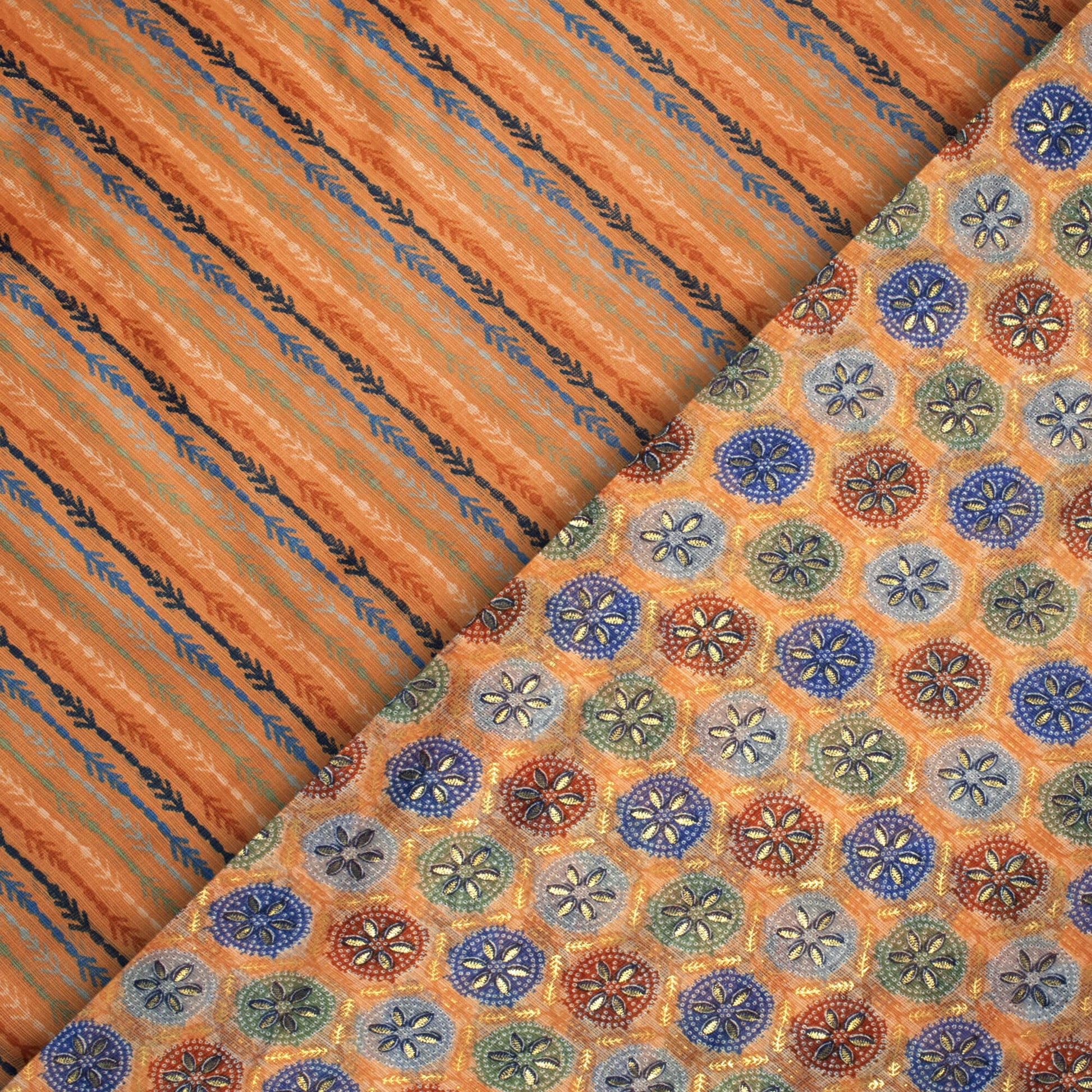 Light Orange And Space Blue Traditional Pattern Foil Print Kota Doria Fabric
