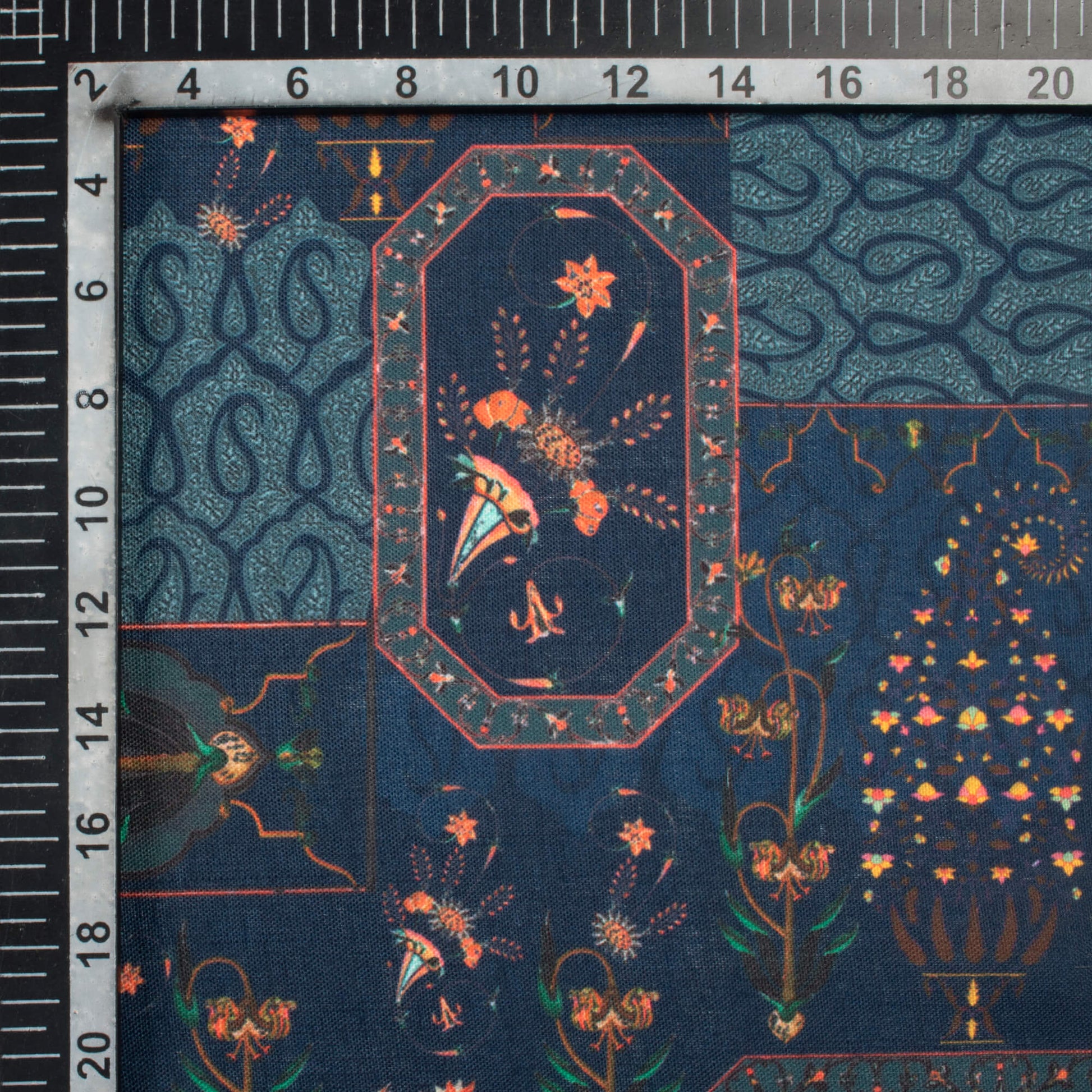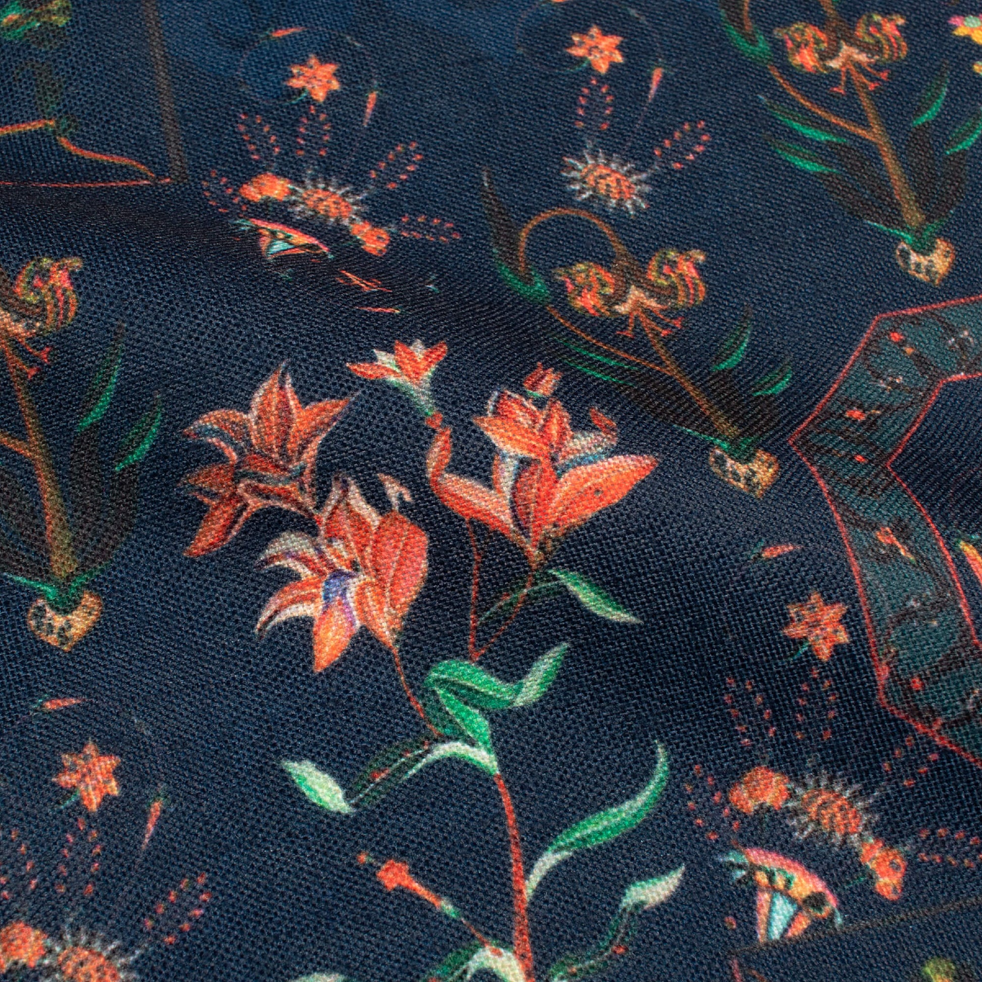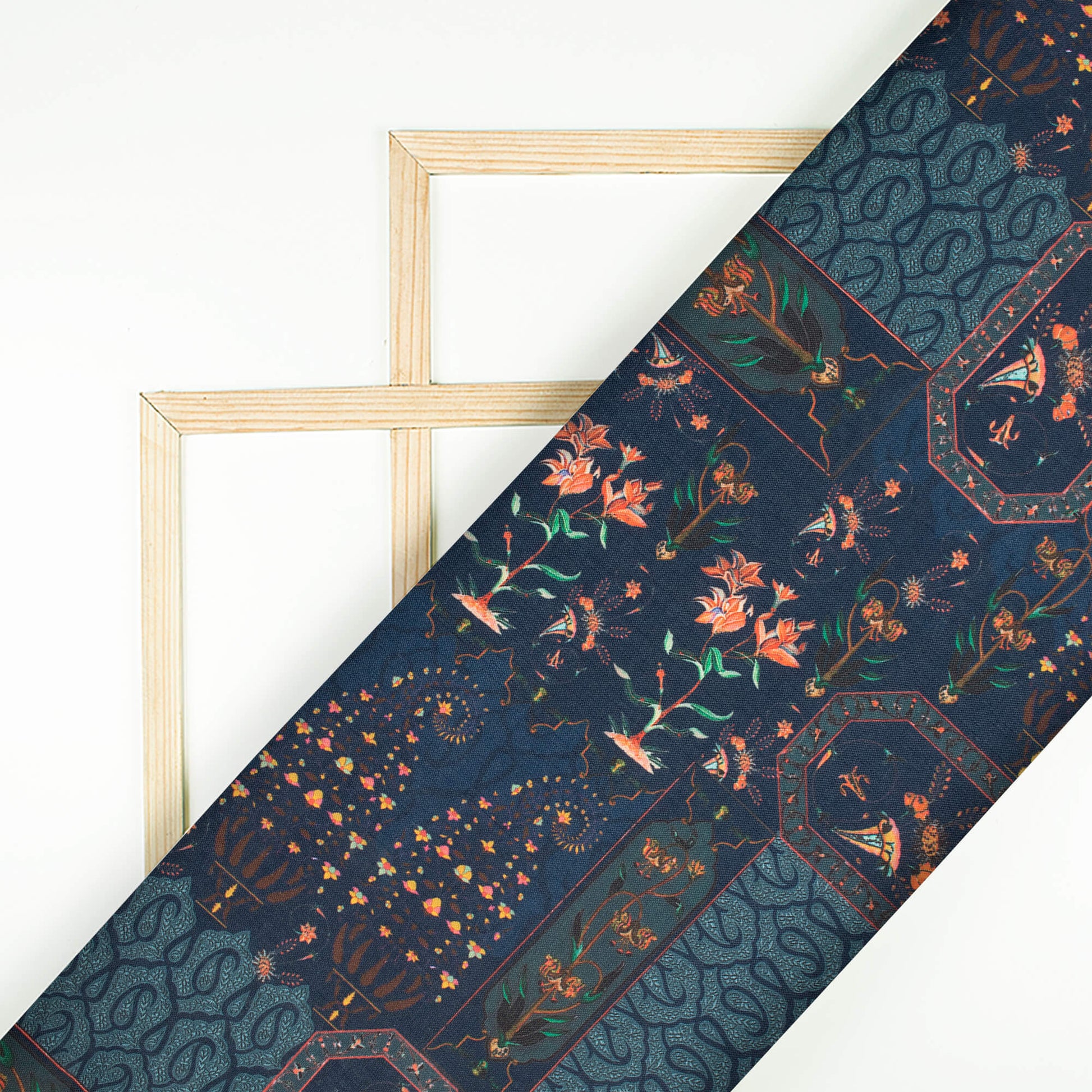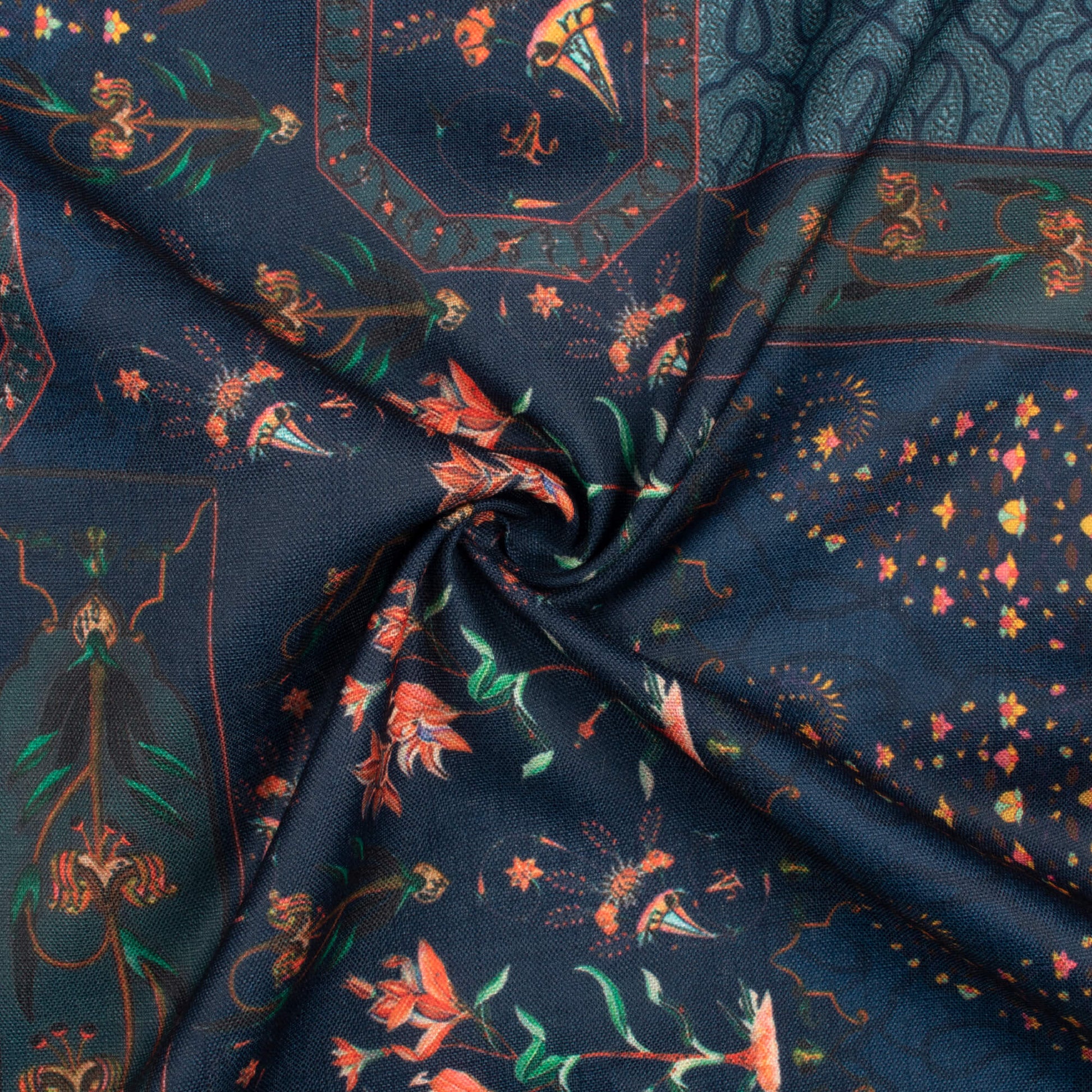 Prussian Blue Traditional Pattern Digital Print Poly Linen Slub Fabric