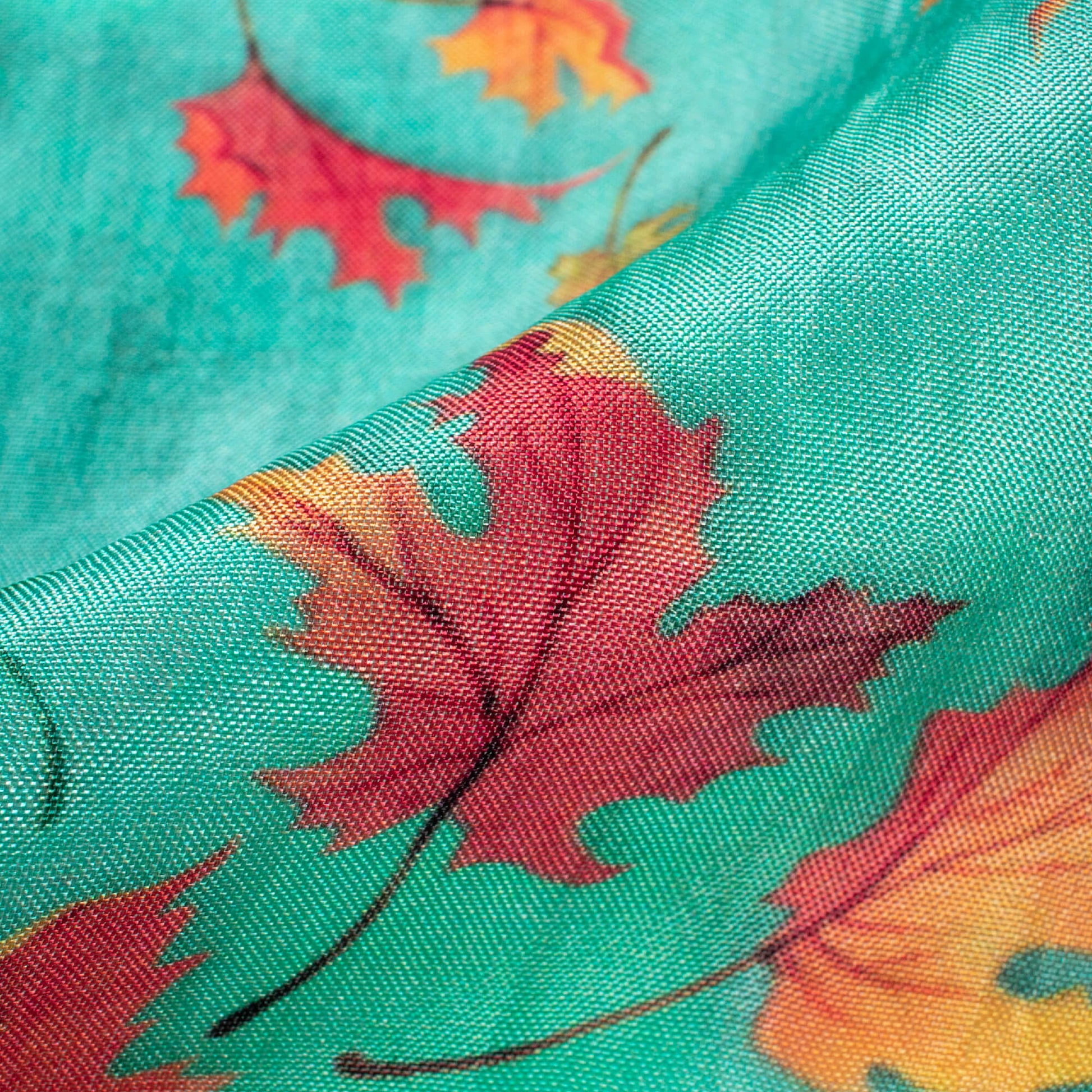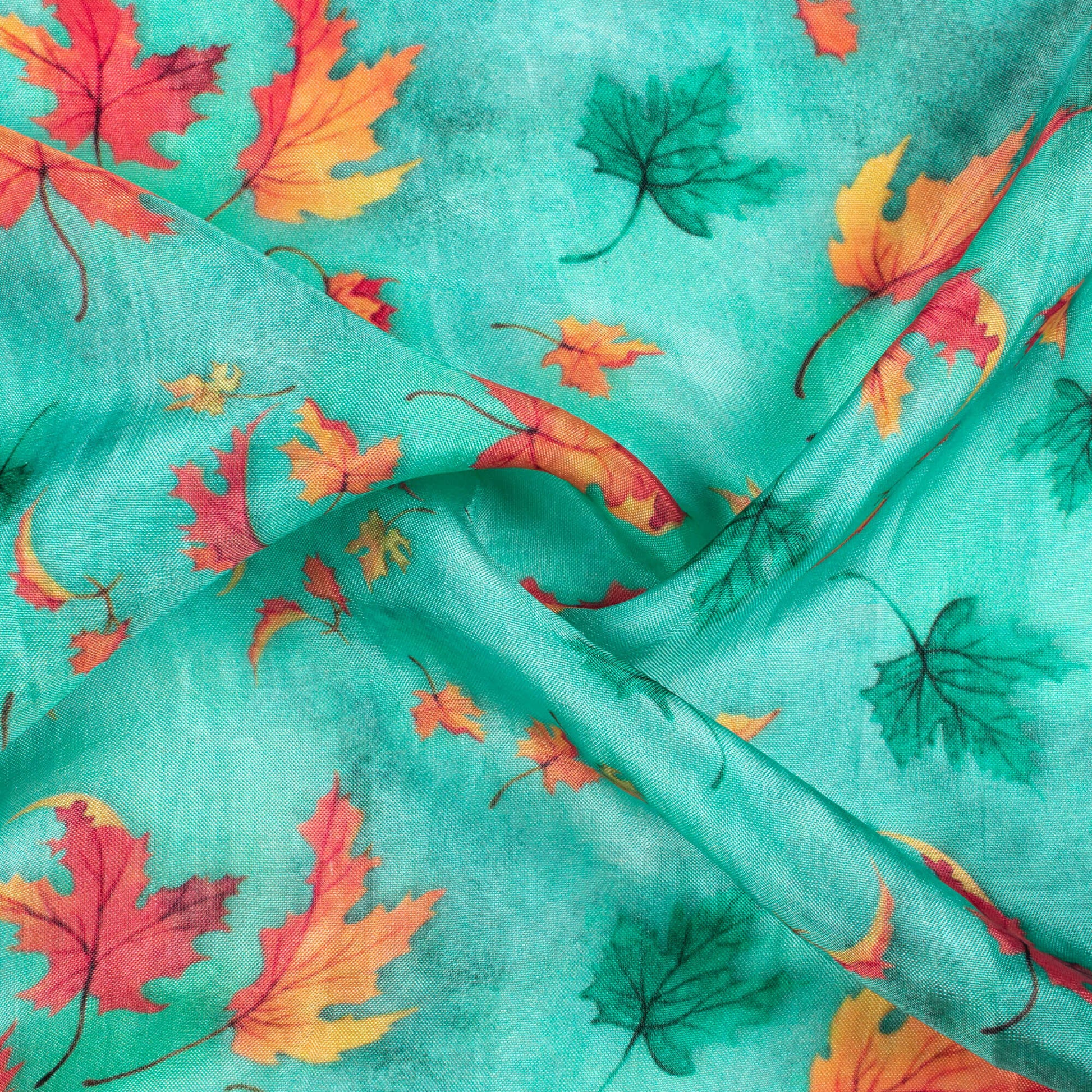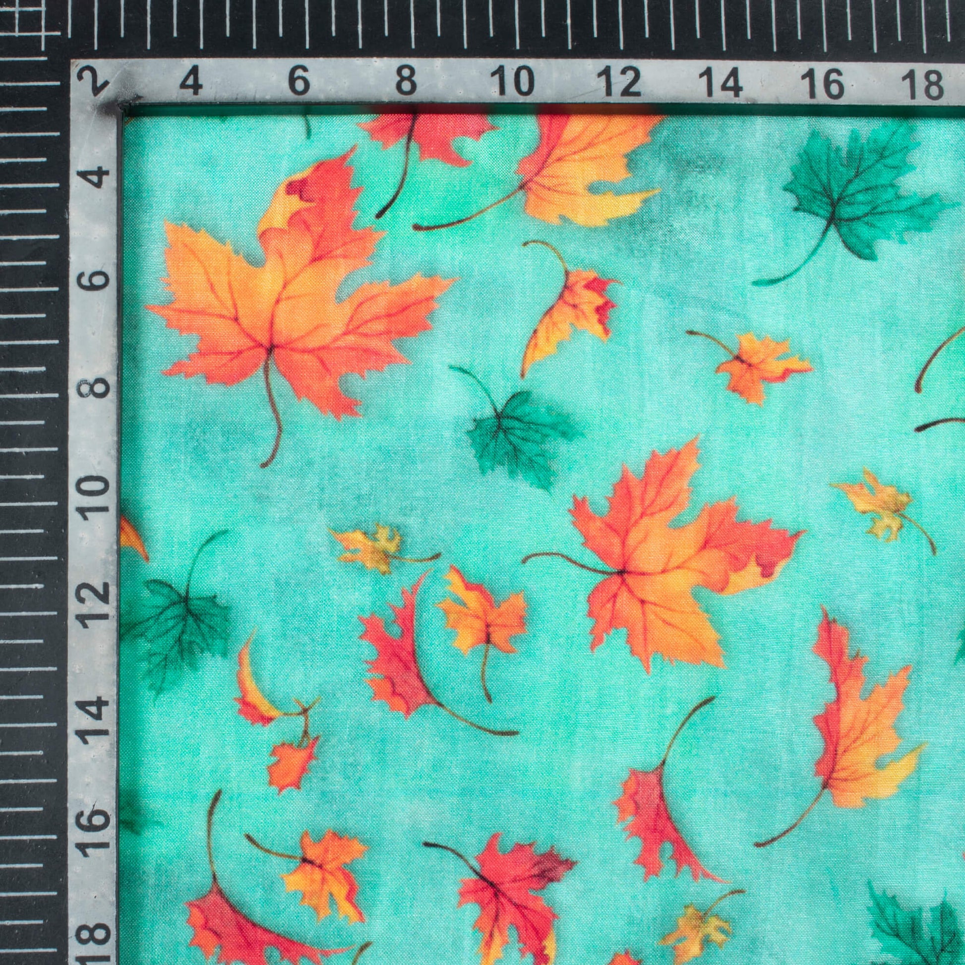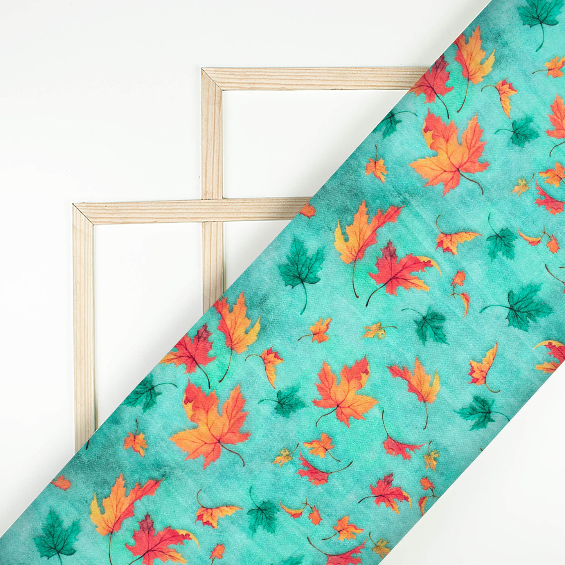 Aqua Blue And Burnt Orange Leaf Pattern Digital Print Viscose Uppada Silk Fabric