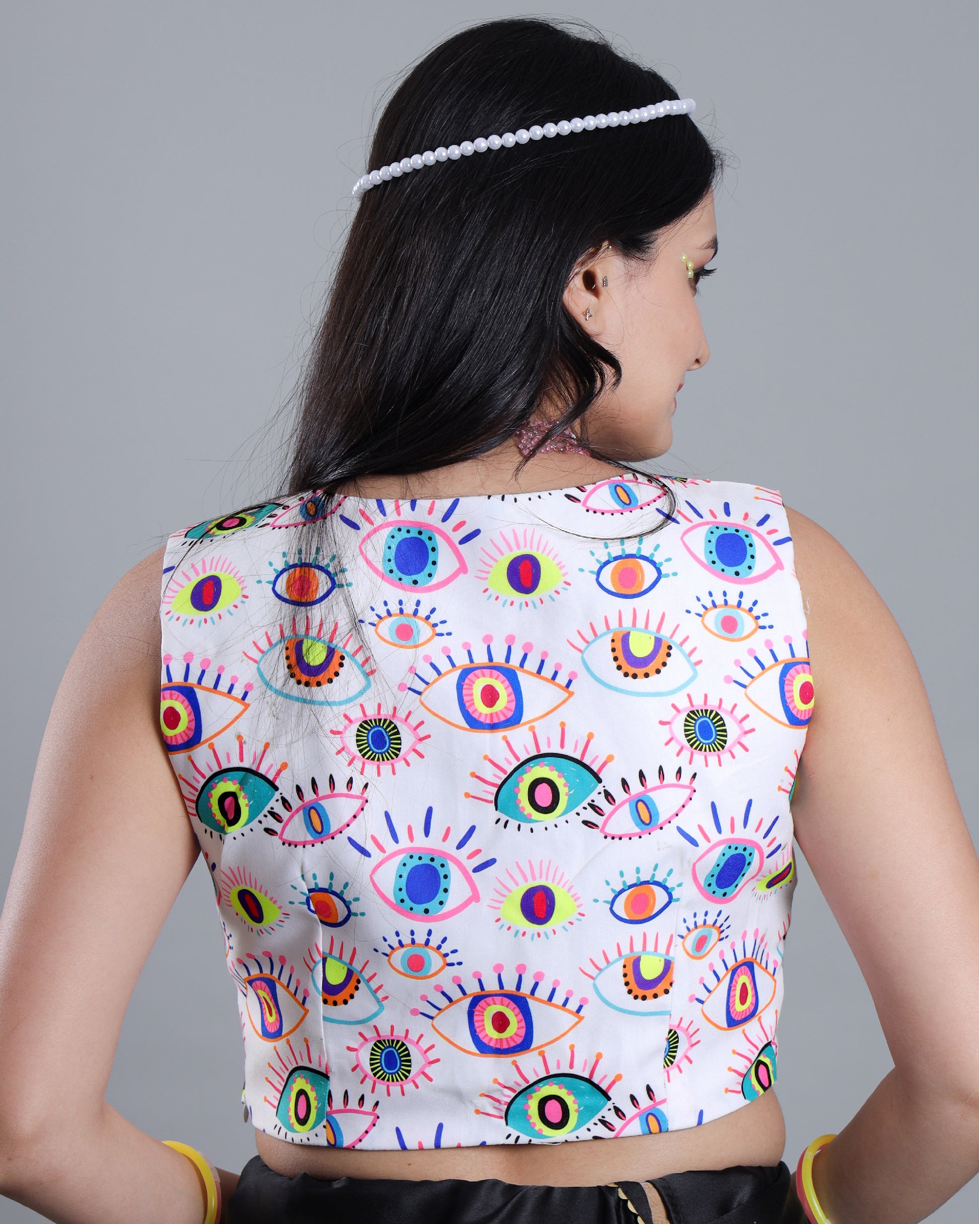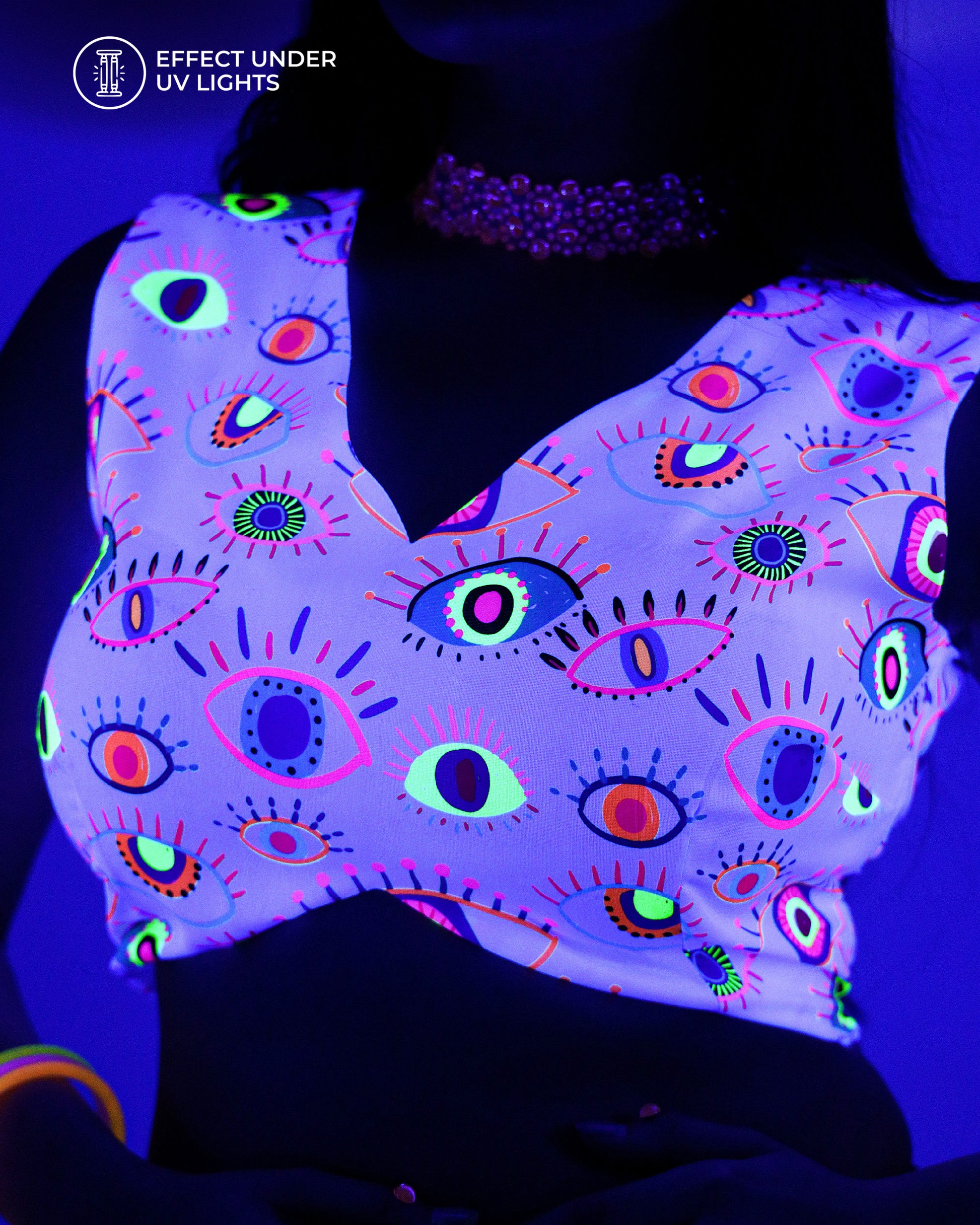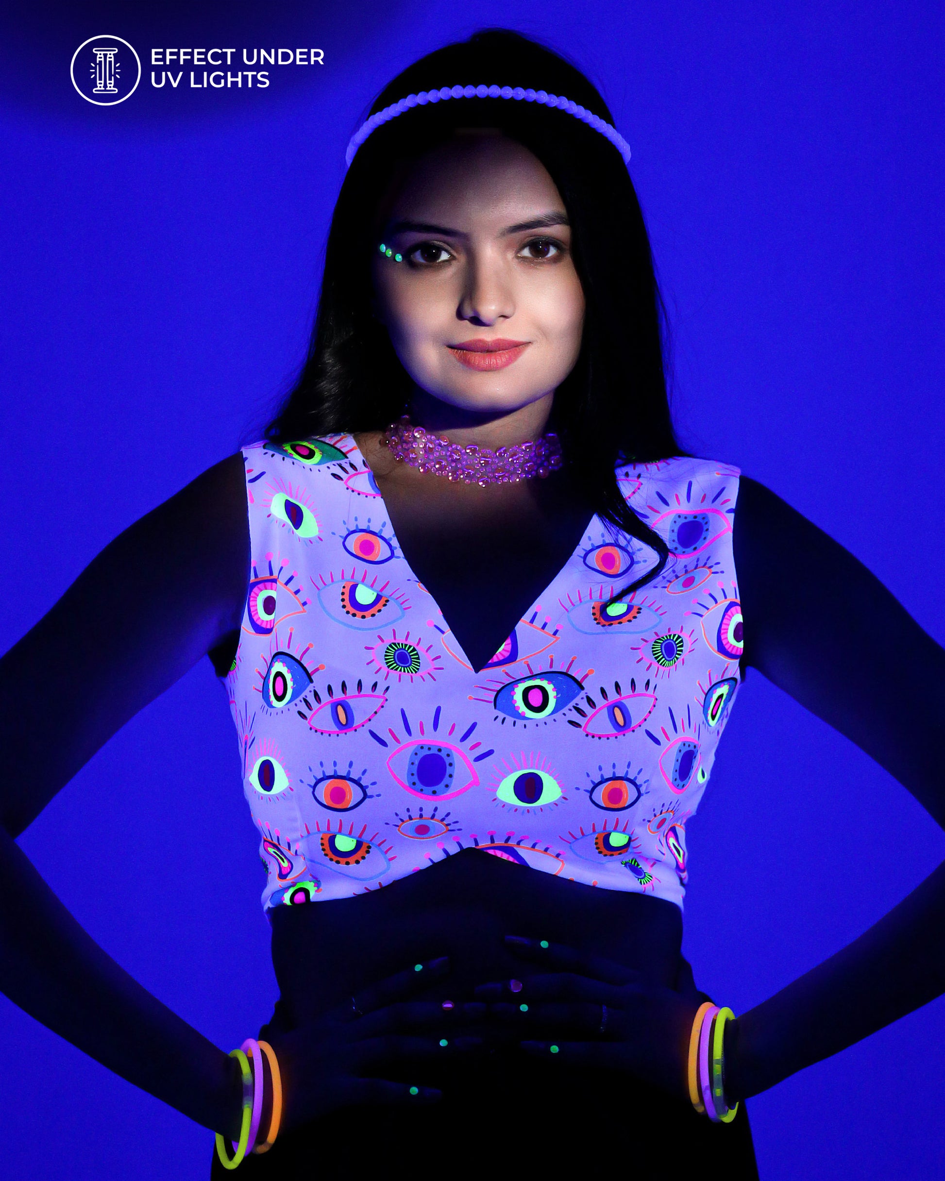This playful blouse will add a pop of color to your wardrobe with its neon hue. In UV light, it shines even brighter! Perfect to pair with sarees, this blouse will surely make you stand out.