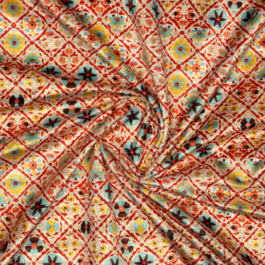 Cream And Red Ethnic Pattern Digital Print Velvet Fabric (Width 58 inches) Cream And Red Ethnic Pattern Digital Print Velvet Fabric (Width 58 inches)