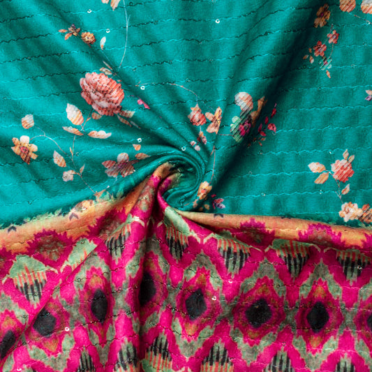 Pine Green And Pink Daman Pattern Sequins Digital Print Superior Velvet Fabric (Width 54 Inches) Pine Green And Pink Daman Pattern Sequins Digital Print Superior Velvet Fabric (Width 54 Inches)