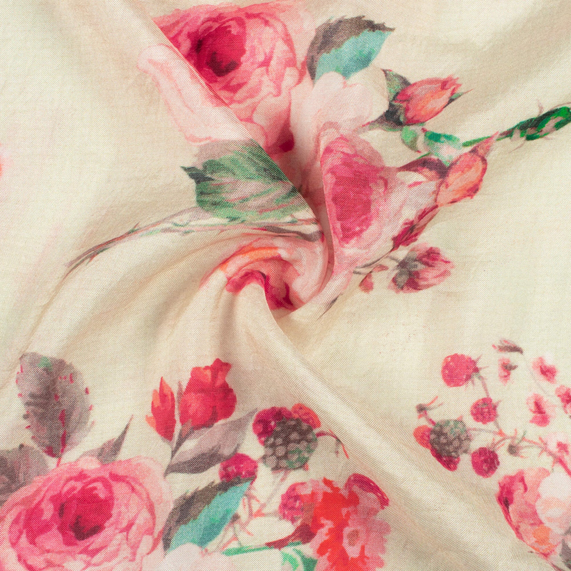 Cream And Rose Red Floral Pattern Digital Print Viscose Muslin Fabric
